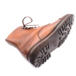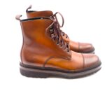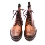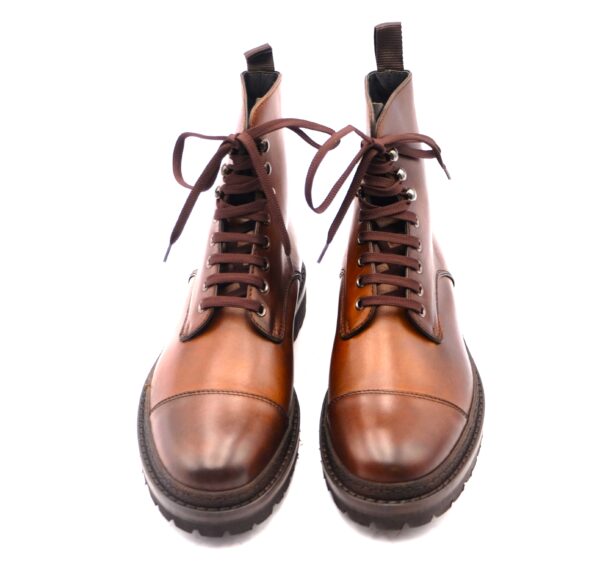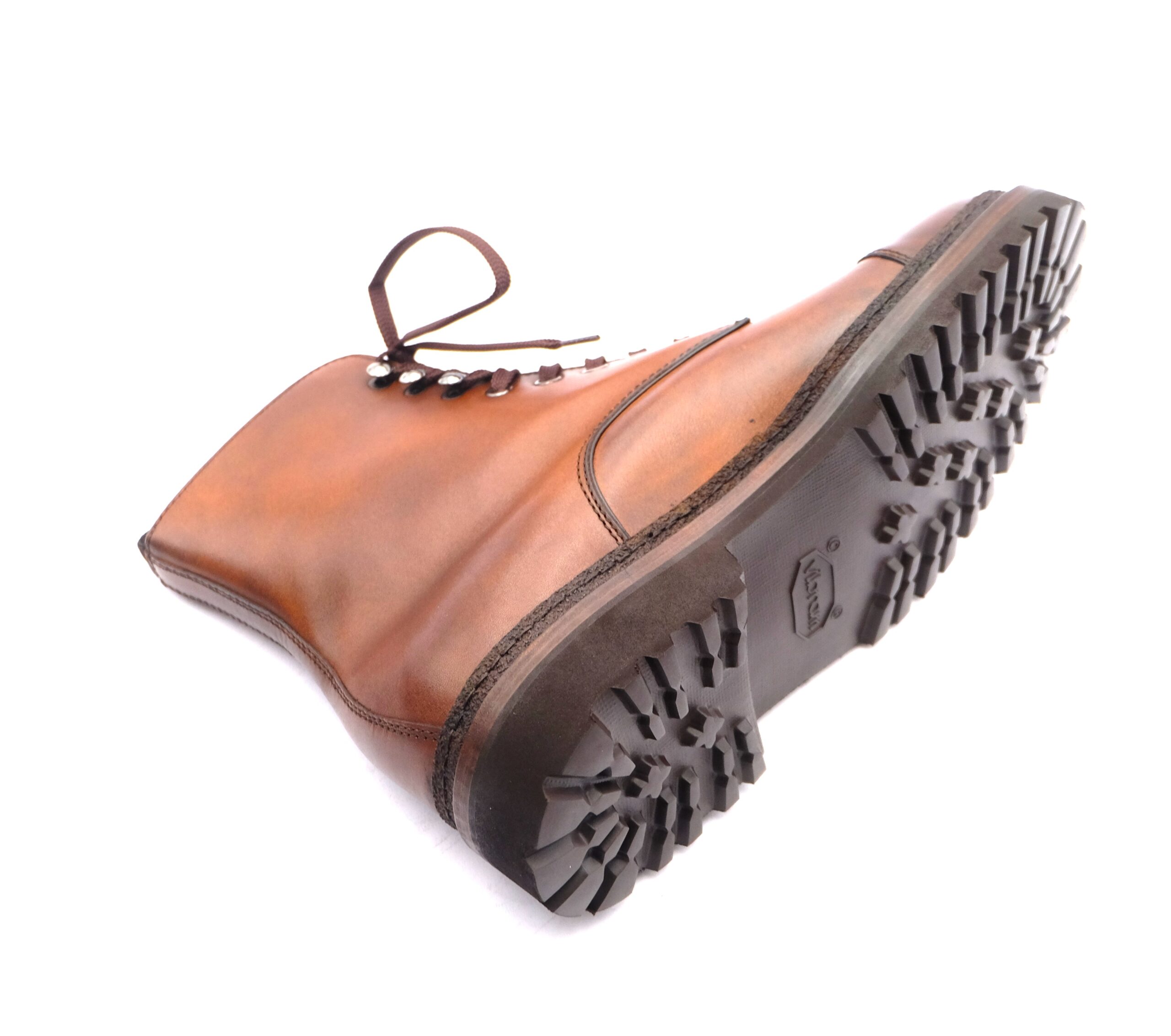Anfibio con puntale realizzato in vitello pieno fiore marrone scuro , suola ultra leggera Vibram, intersuola in cuoio doppio, linguetta in vitello nappato antipioggia, calzata abbondante.