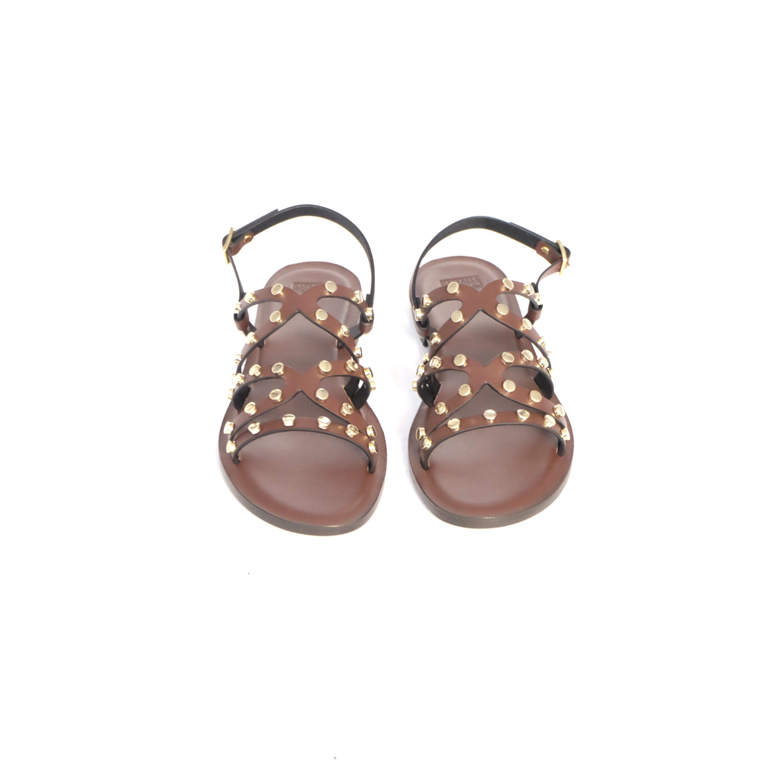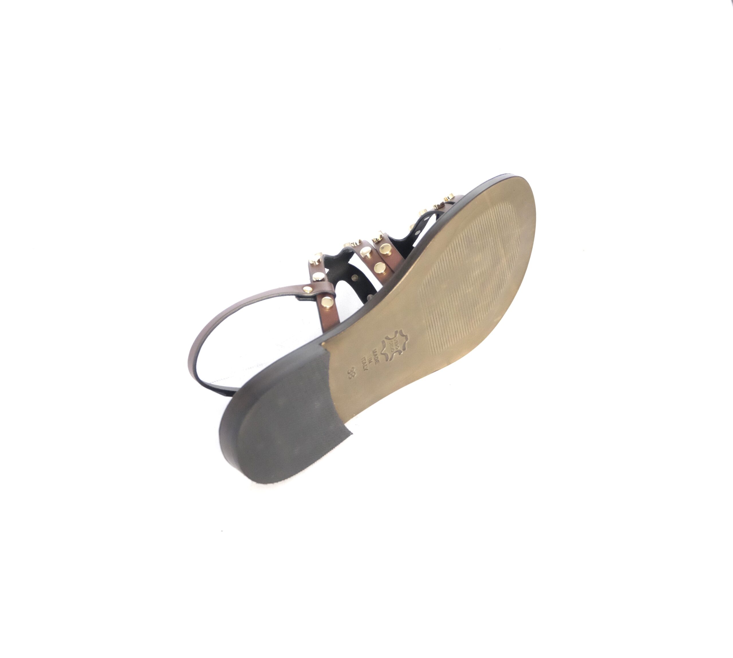 Caprese con applicazione borchiate oro, pelle color cacao , cinturino caviglia con fibbia, sottopiede imbottito in pelle, suola in cuoio flessibile e antiscivolo, calzata standard