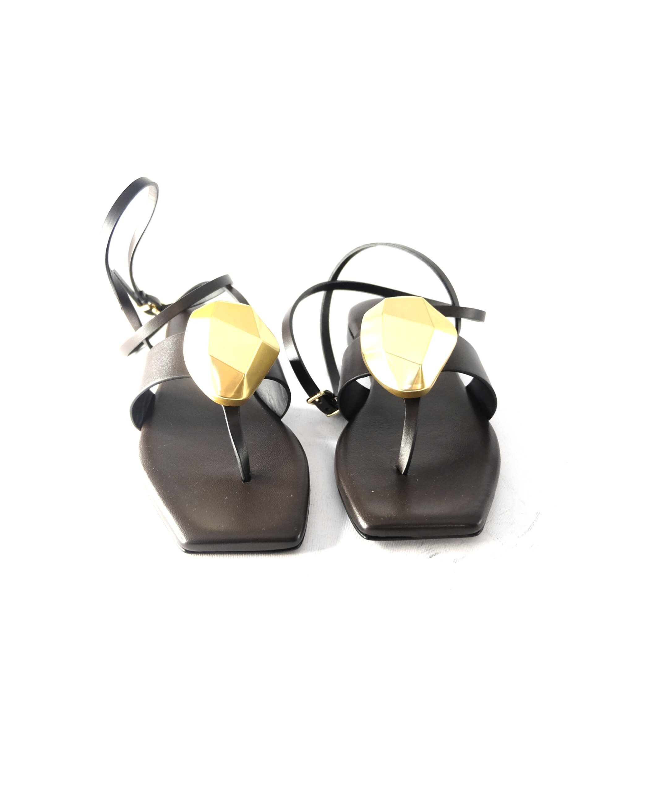 Caprese con cinturino in pelle fondente con accessorio scultura in oro satinato, sottopiede imbottito in pelle, suola in cuoio flessibile antiscivolo, calzata standard