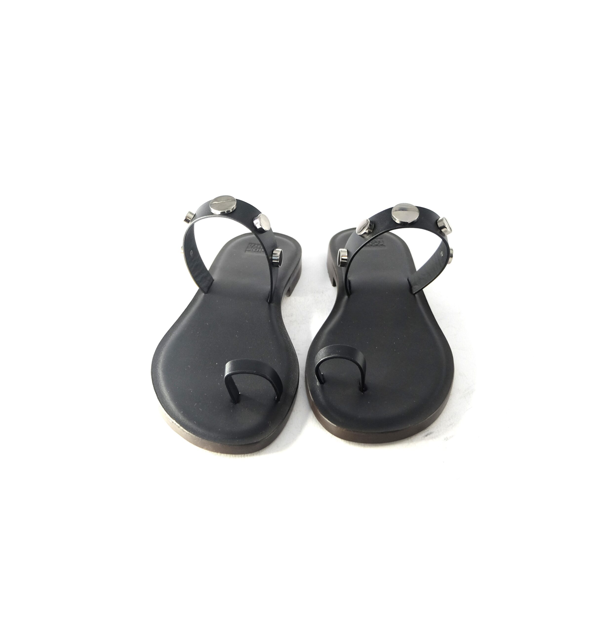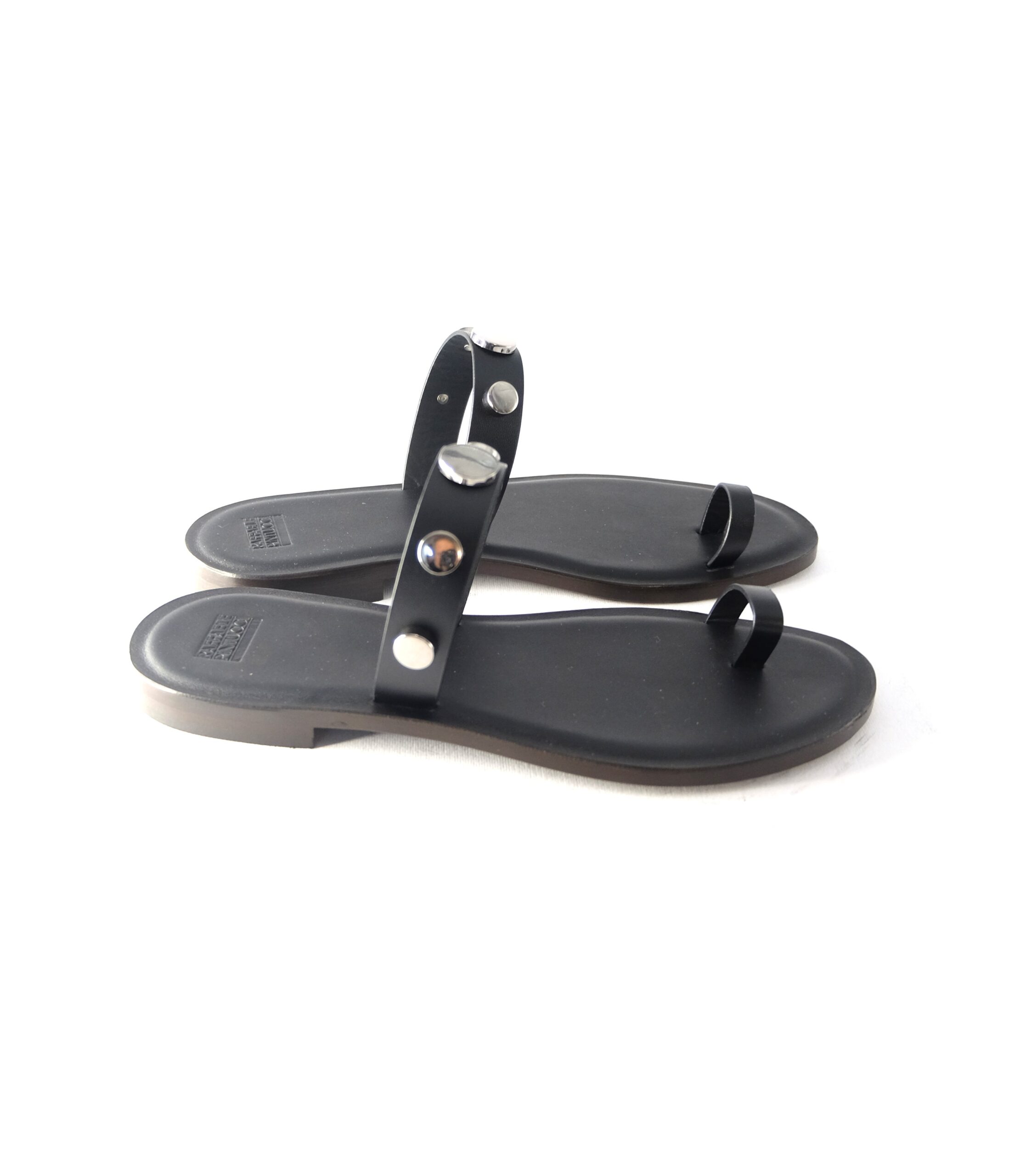Caprese con infradito alluce, pelle nera con borchie acciaio, sottopiede imbottito pelle, suola cuoio flessibile antiscivolo, calzata standard