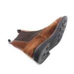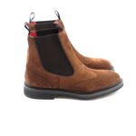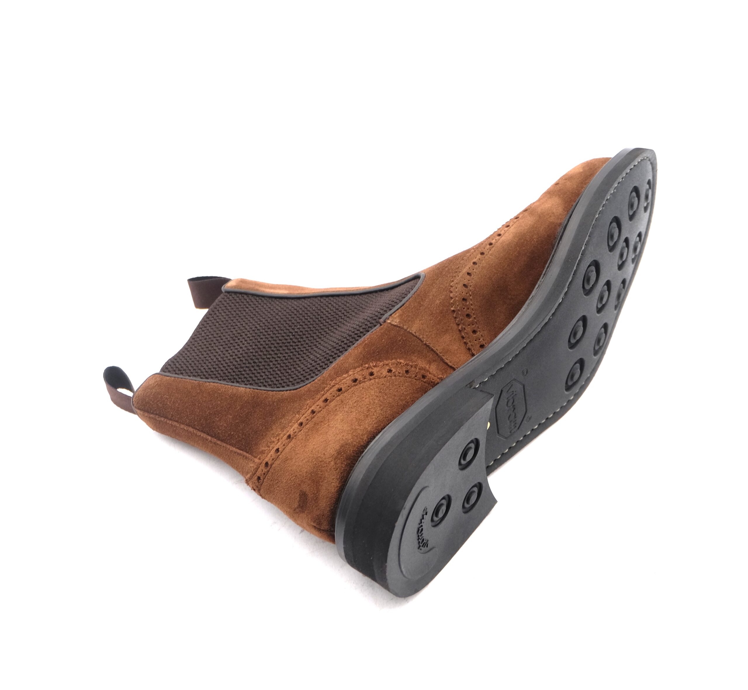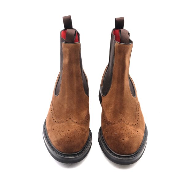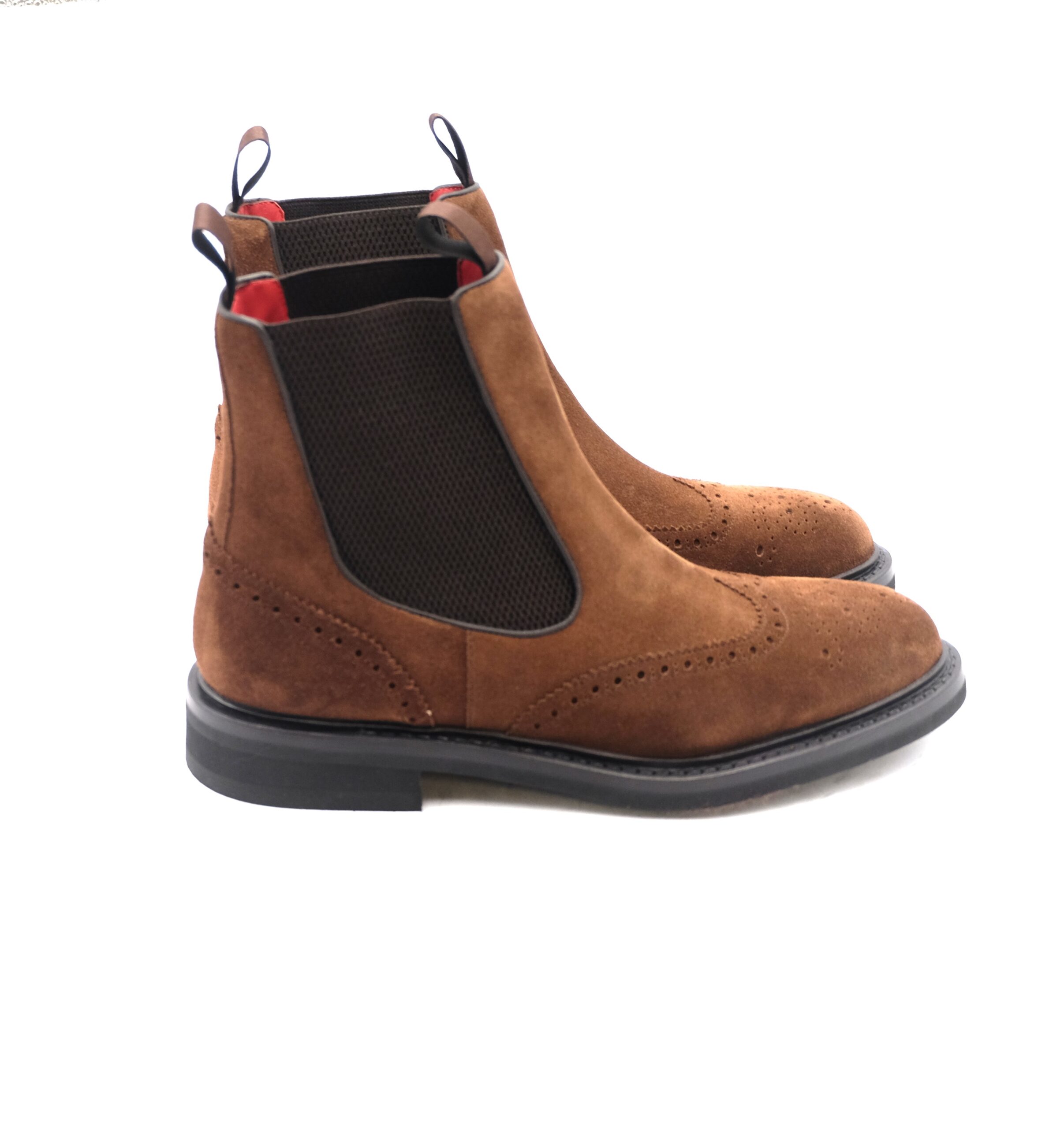 Chelsea boot in camoscio tabacco idrorepellente, sottopiede interno in cuoio imbottito, suola in cuoio con gomma dainite Vibram antipioggia, fodera in pelle rossa, calzata standard