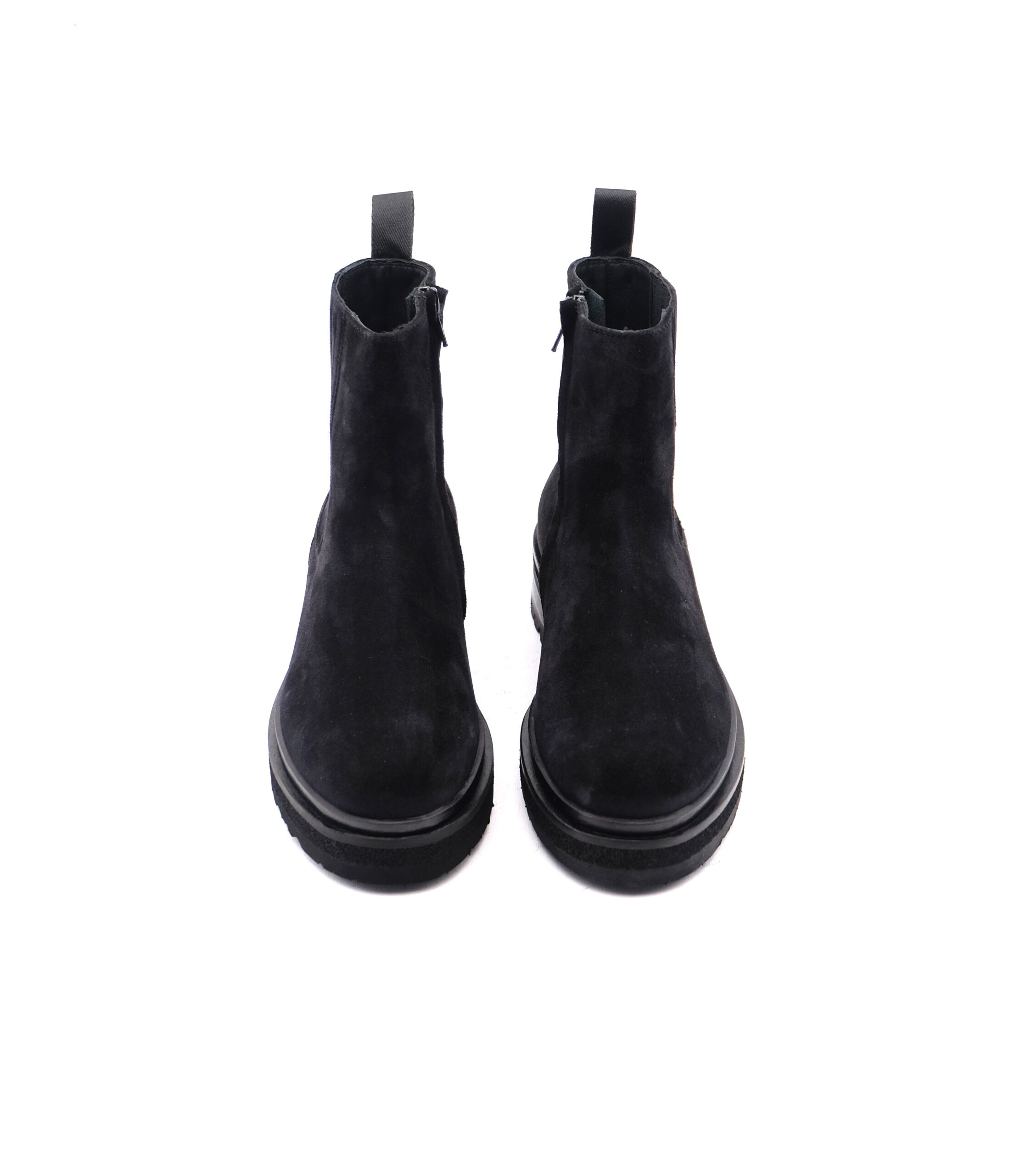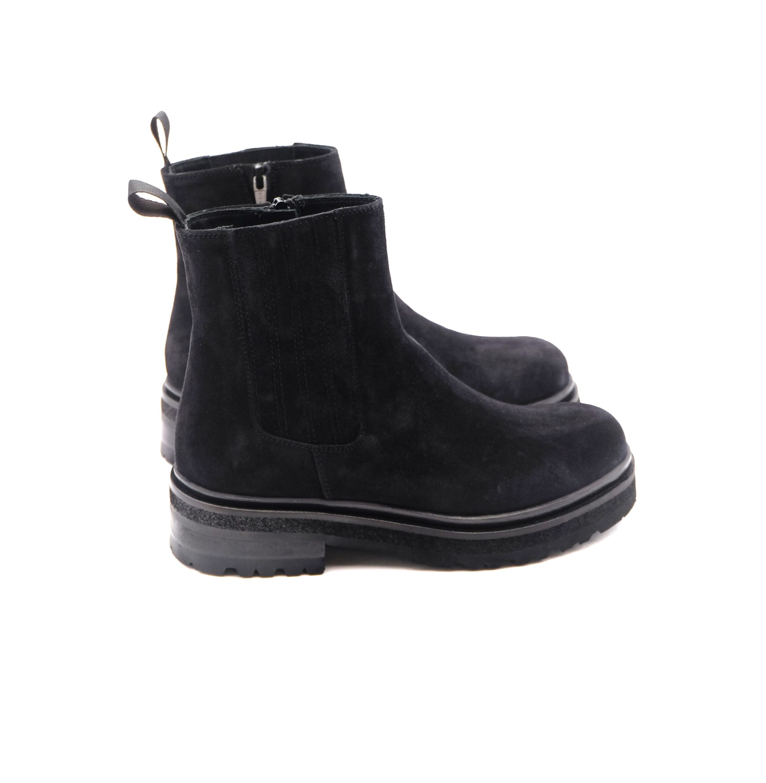 Chelsea in camoscio nera, cerniera interna ed elastico esterno , suola roccia in gomma leggera e antiscivolo, sottopiede interno in cuoio, calzata standard