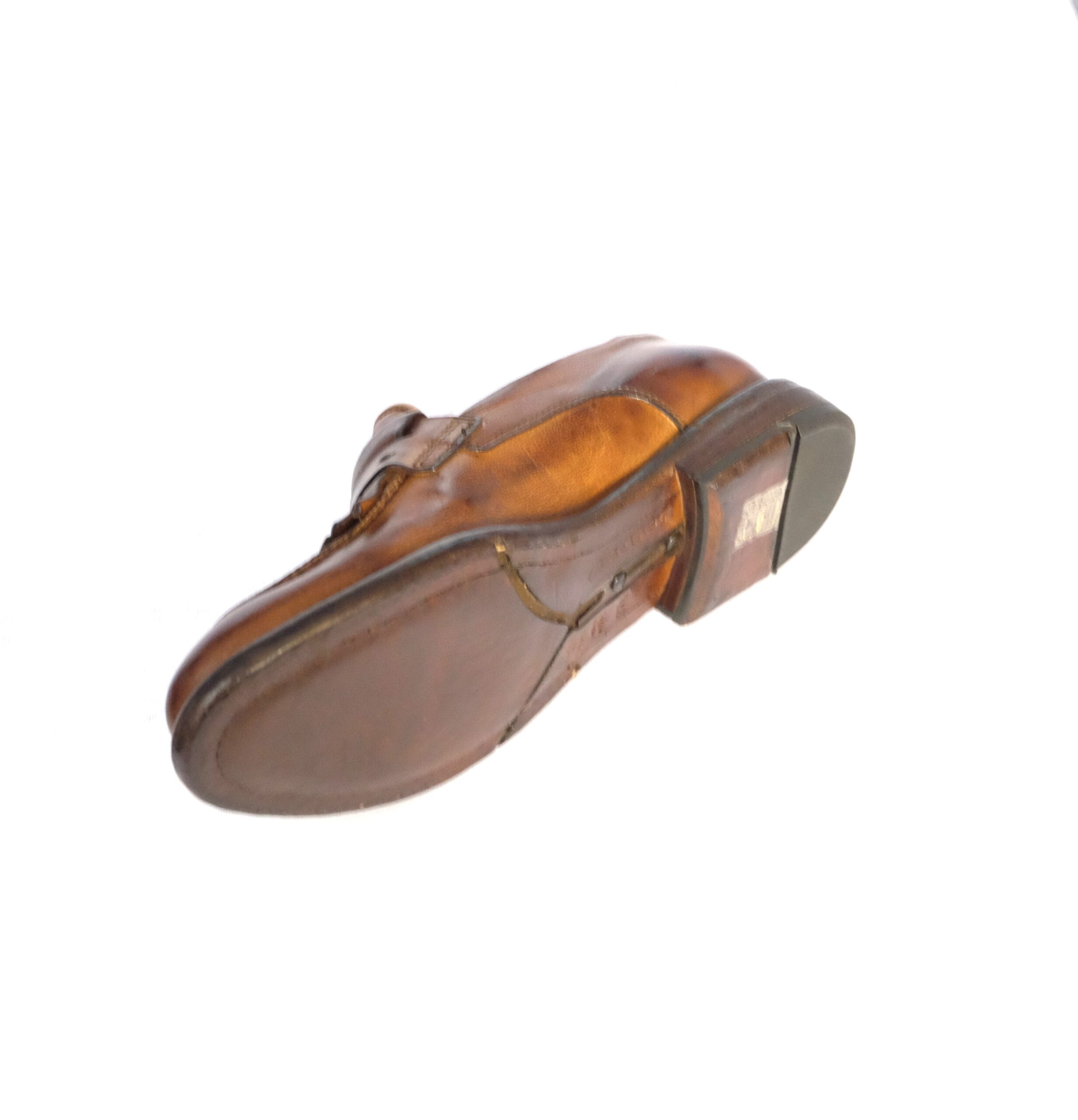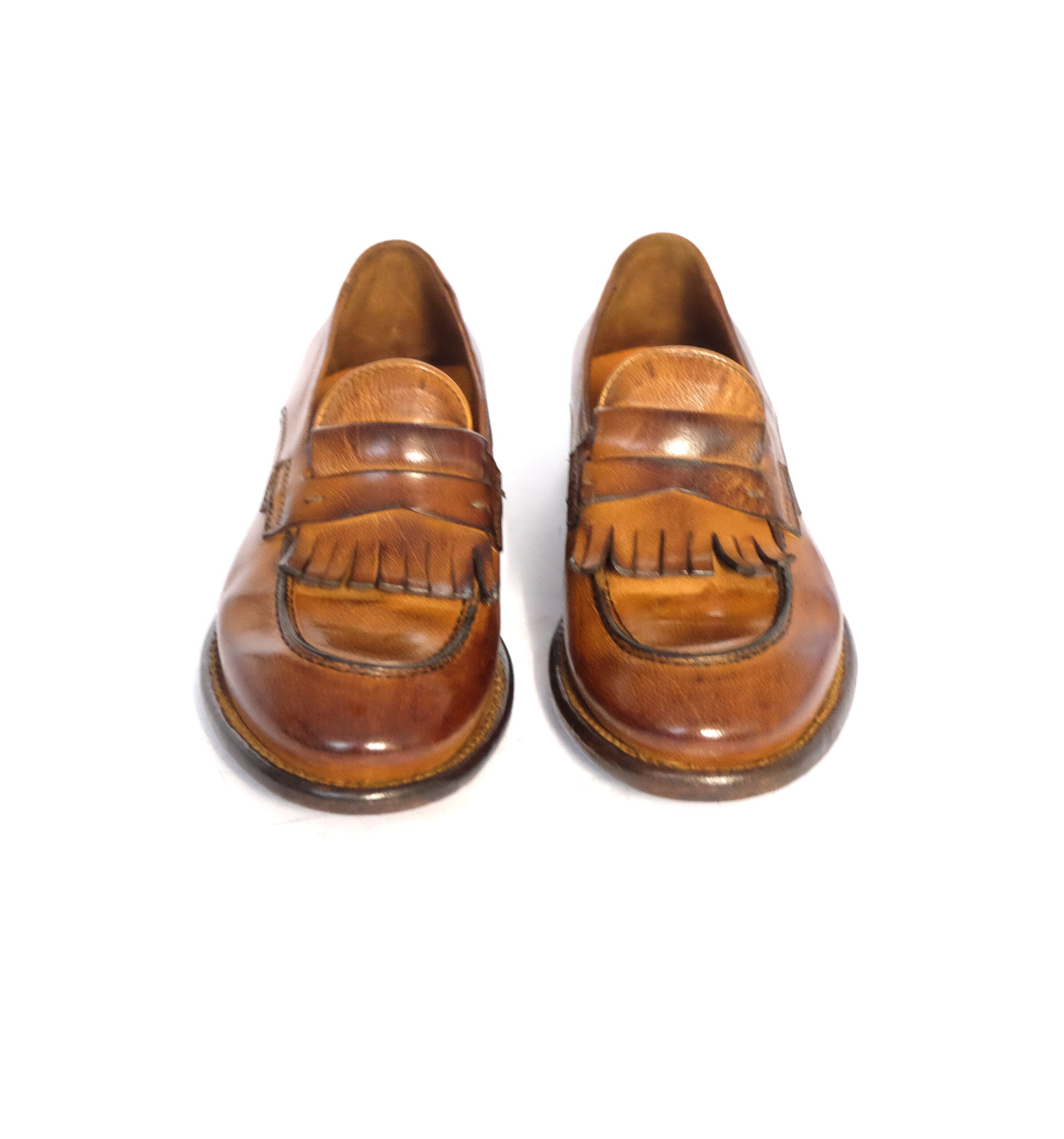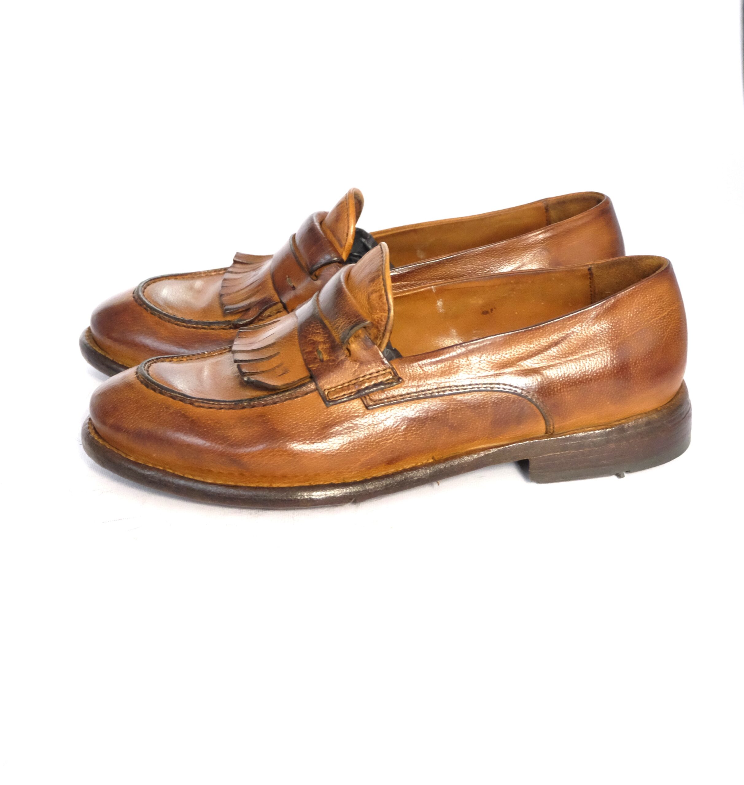 College con frangia in pelle vintage cognac , lavorazione mezza fodera, suola in cuoio flessibile antiscivolo, invecchiamo a mano dai maestri marchigiani, calzata standard