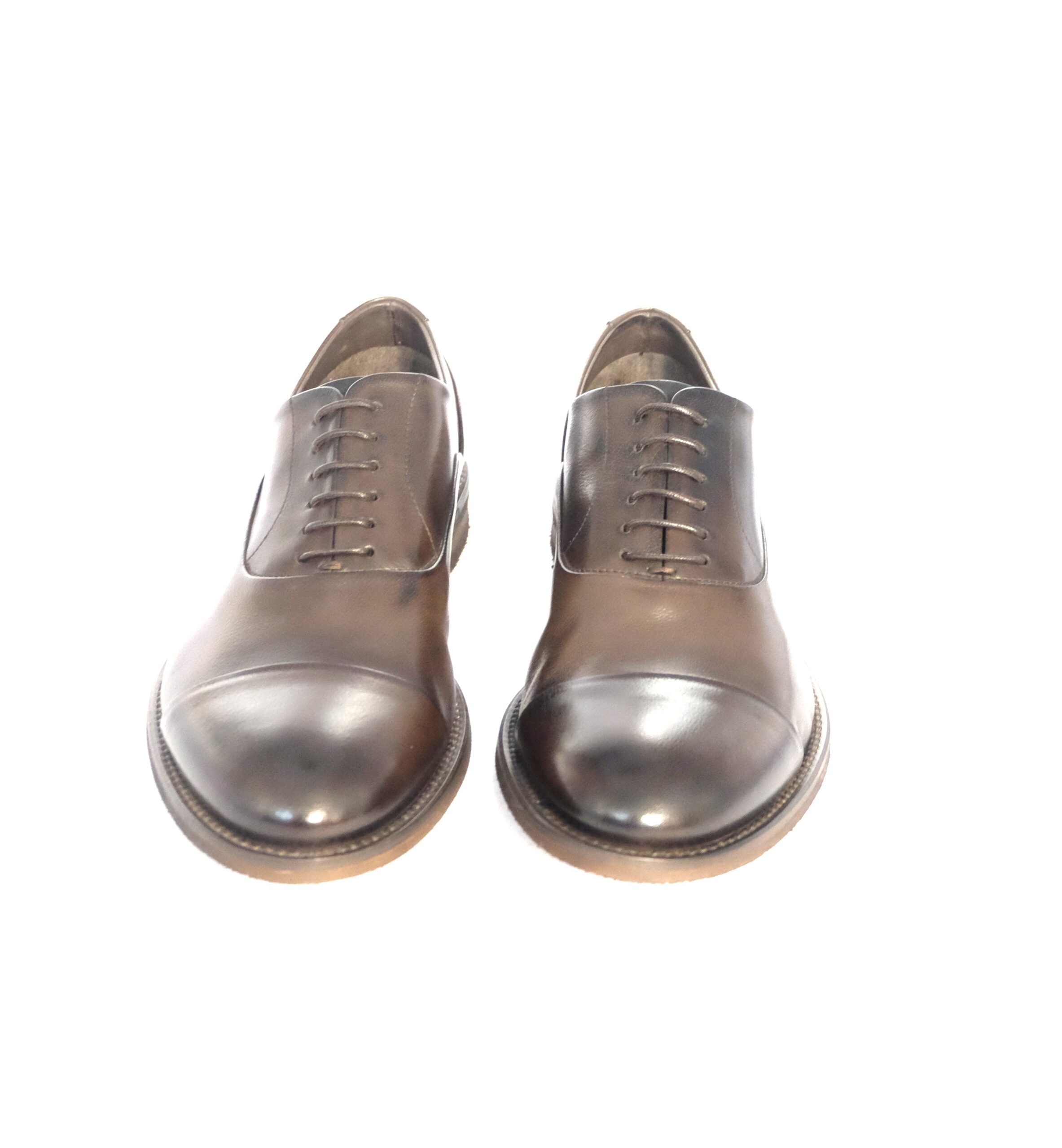 Francesina con puntale realizzata in vitello nappato testa di moro, lavorazione blake sfoderata, suola in para vegetale flessibile ed antiscivolo, calzata standard