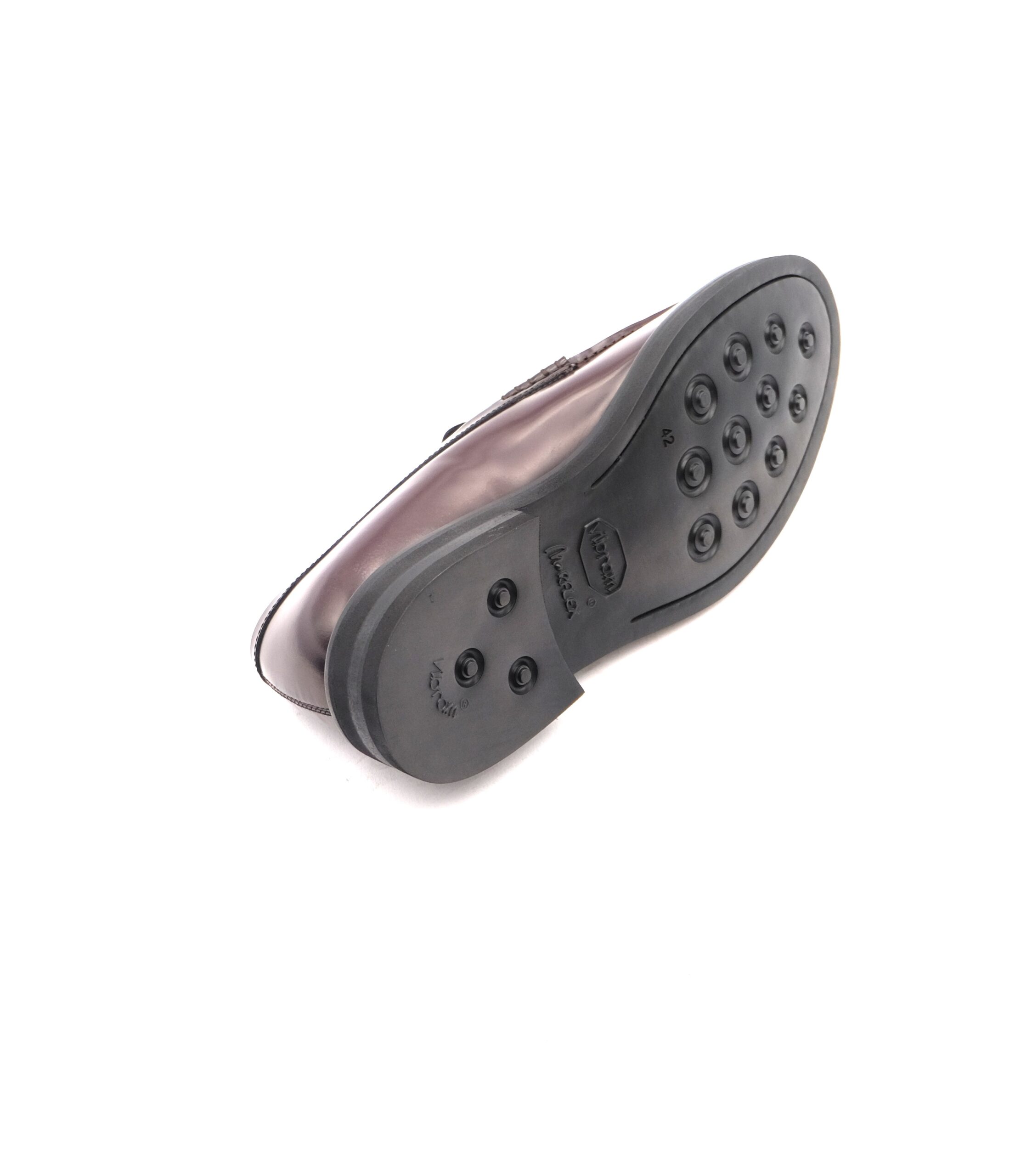 Mocassino con vaschetta liscia in vitello bordeaux, suola in cuoio flessibile con gomma Vibram antiscivolo ed anti pioggia, fodera in vitello, calzata standard