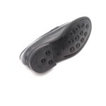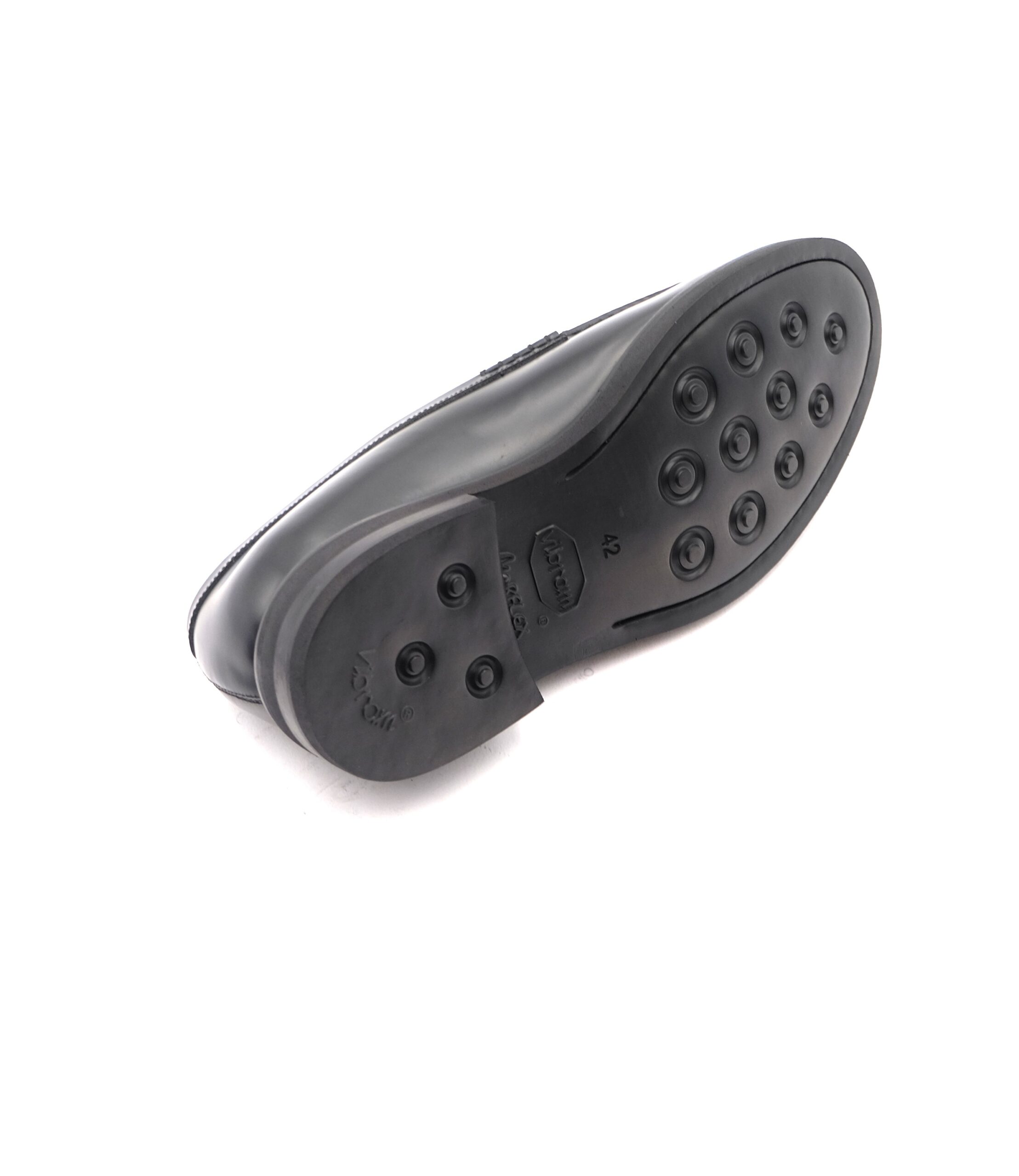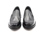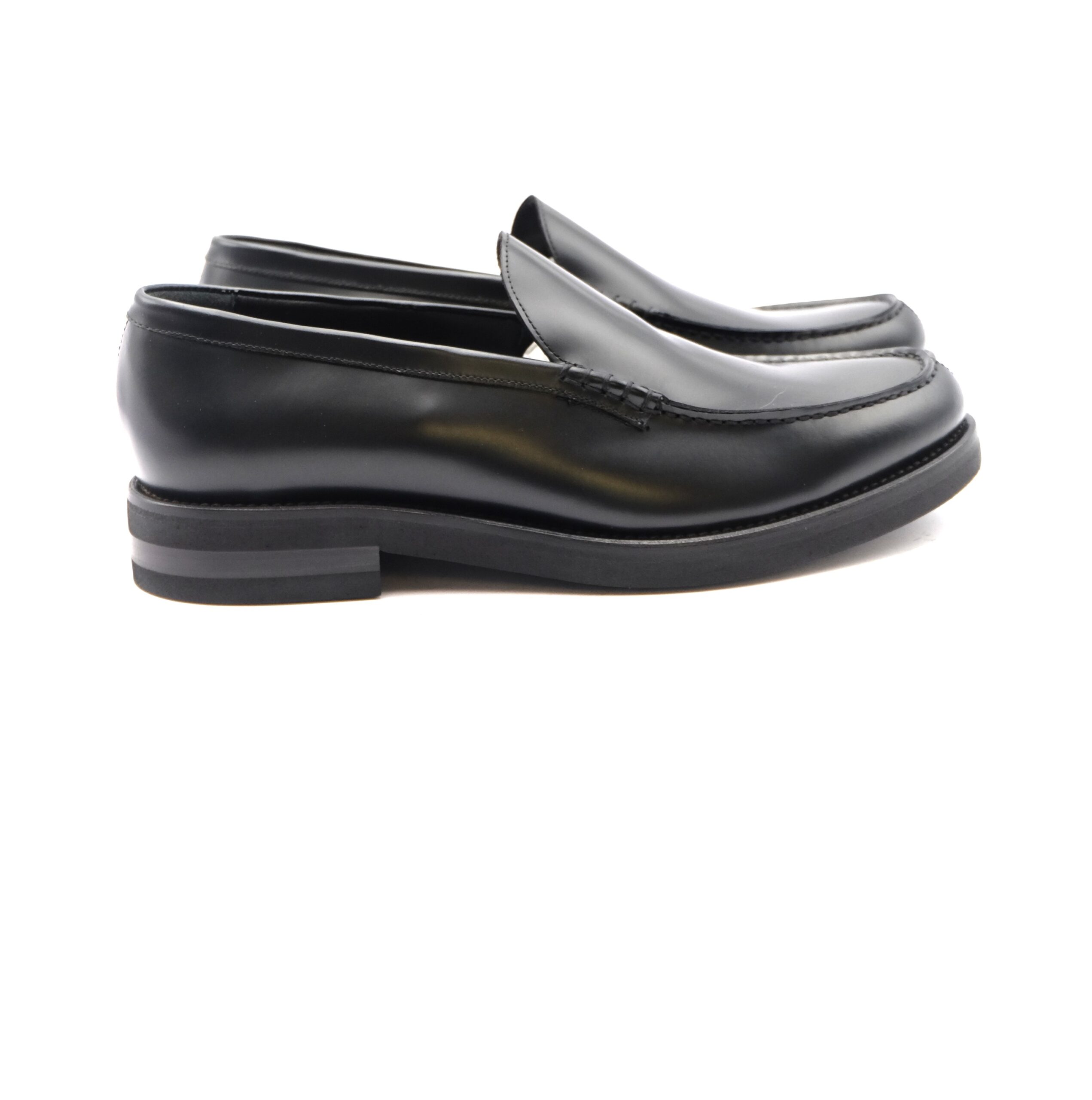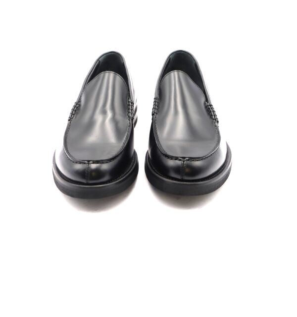 Mocassino con vaschetta liscia in vitello nero, suola in cuoio flessibile con gomma Vibram antiscivolo ed anti pioggia, fodera in vitello, calzata standard