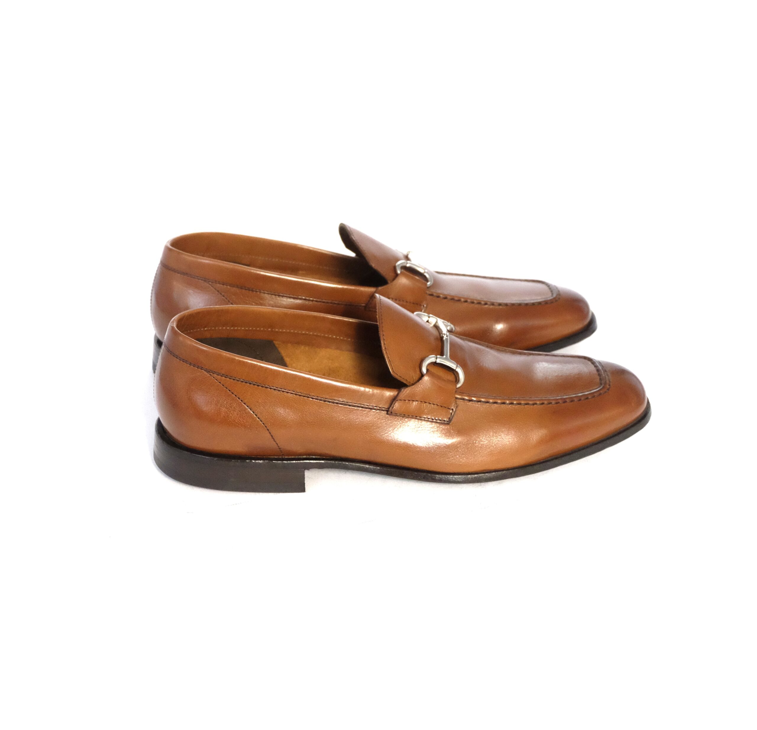 Mocassino con morsetto in nikel lucido in vitello nappato color cuoio, lavorazione sfoderata , suola in cuoio morbido e flessibile con inserto antiscivolo, calzata comoda