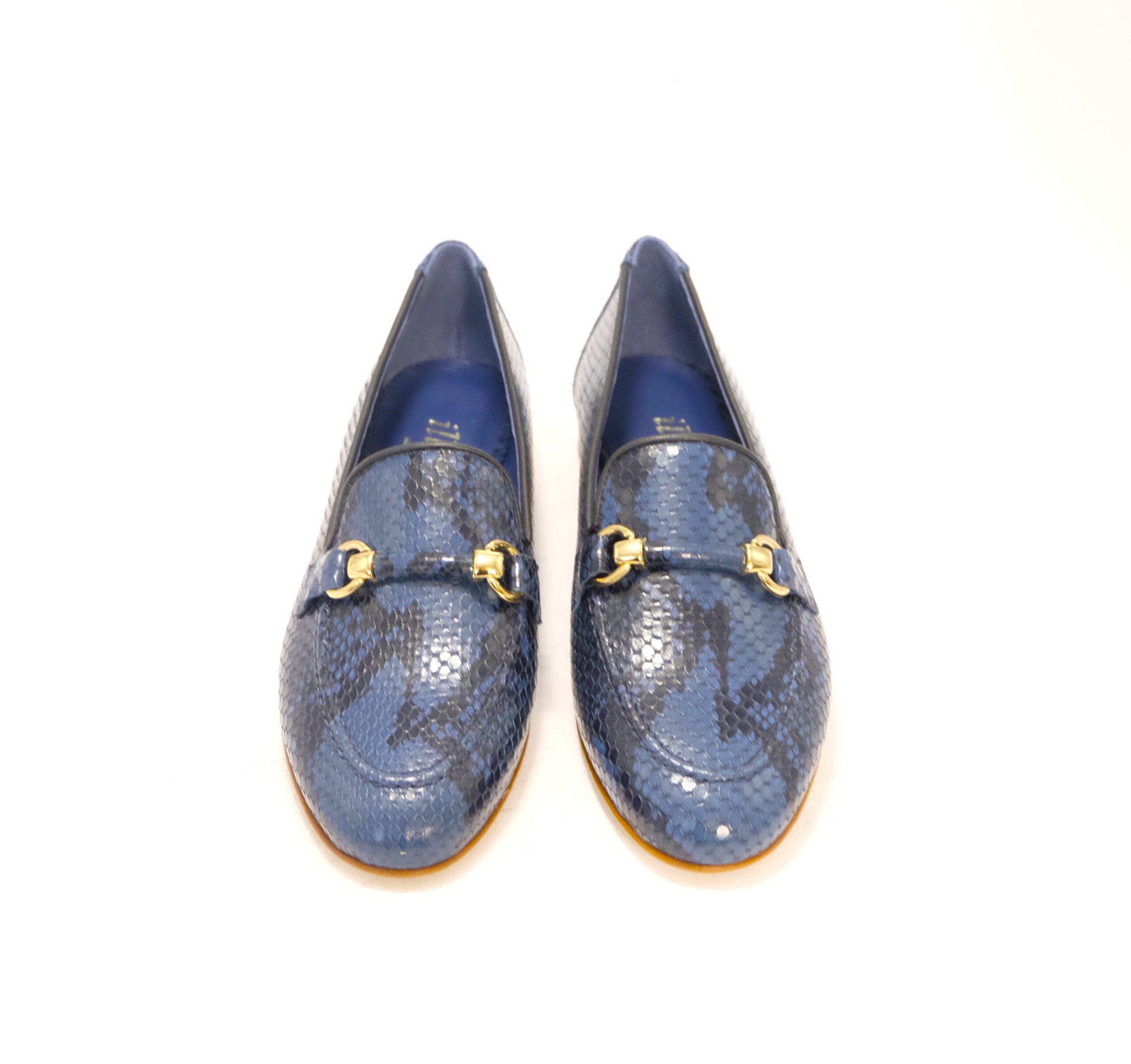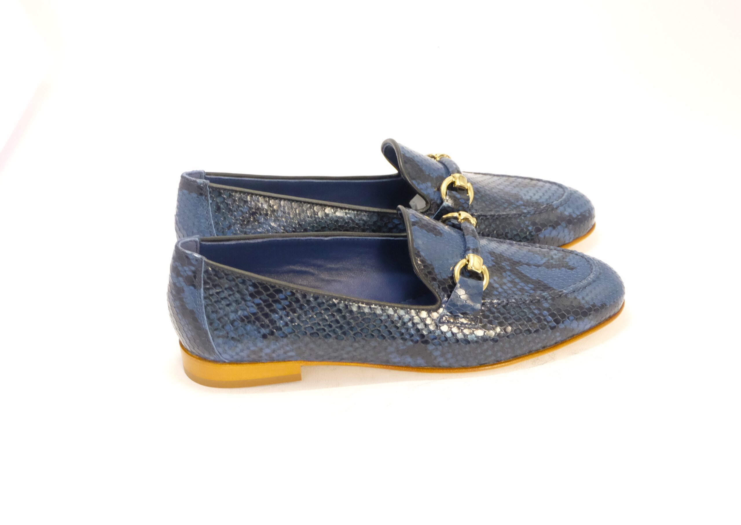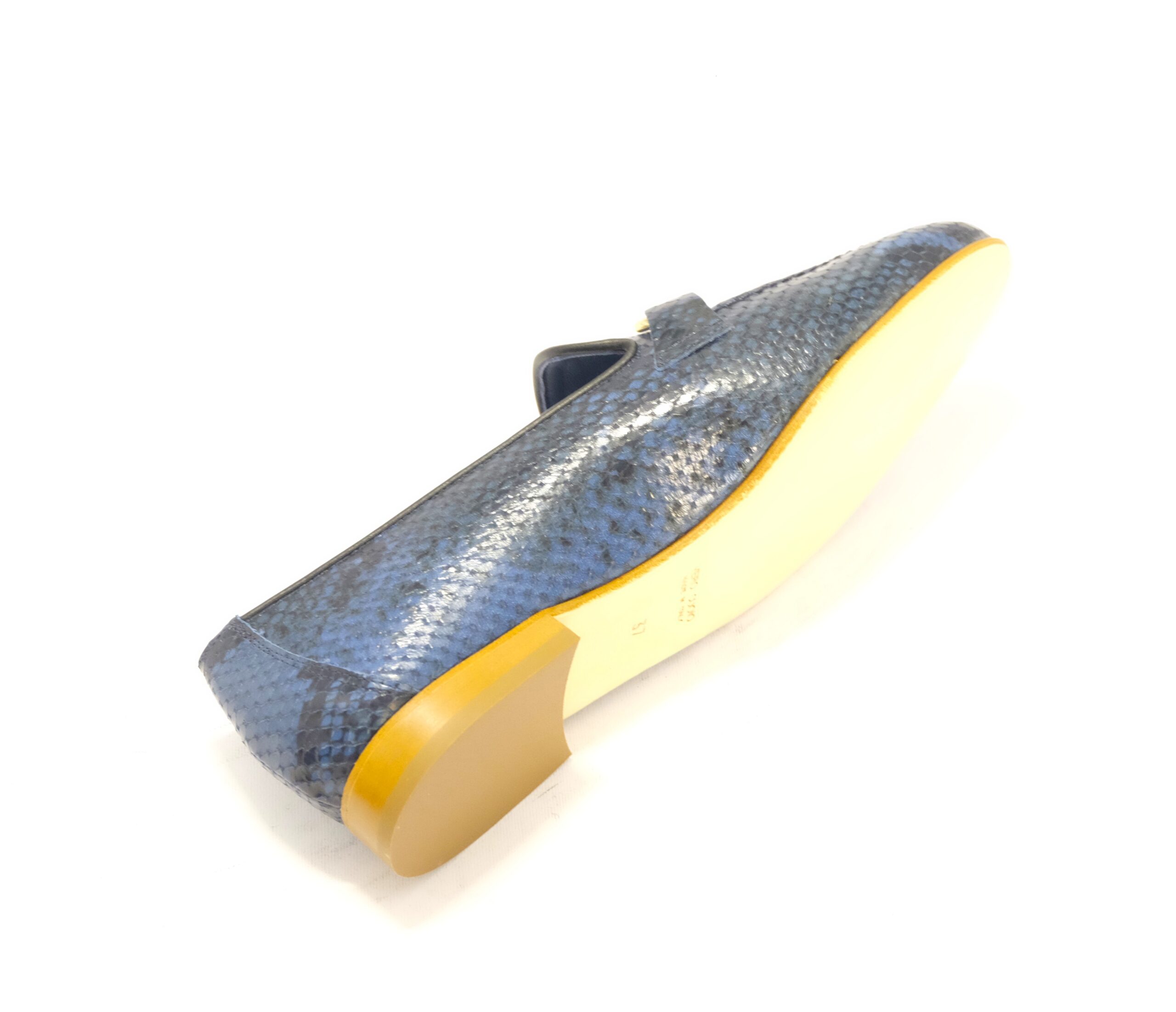 Mocassino con morsetto rivestito, tomaia realizzata in stampa pitonata blu, suola in cuoio flessibile, sottopiede imbottito, tacco antiscivolo, calzata standard
