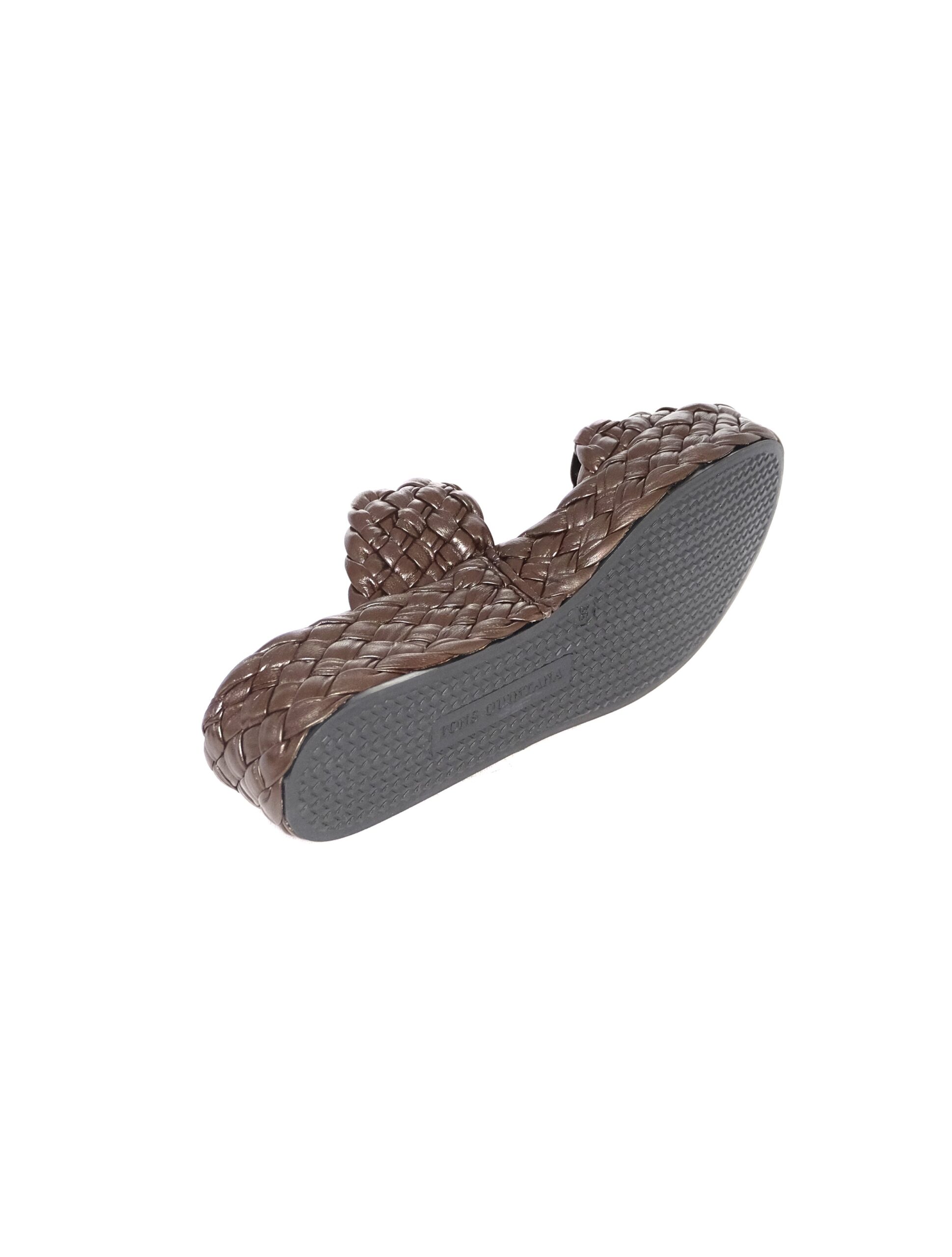 Sandalo in pelle intrecciata larga con doppia fascia, color caffè , sottopiede in pelle imbottita, suola in gomma leggerissima antiscivolo, calzata standard, zeppa rivestita in pelle