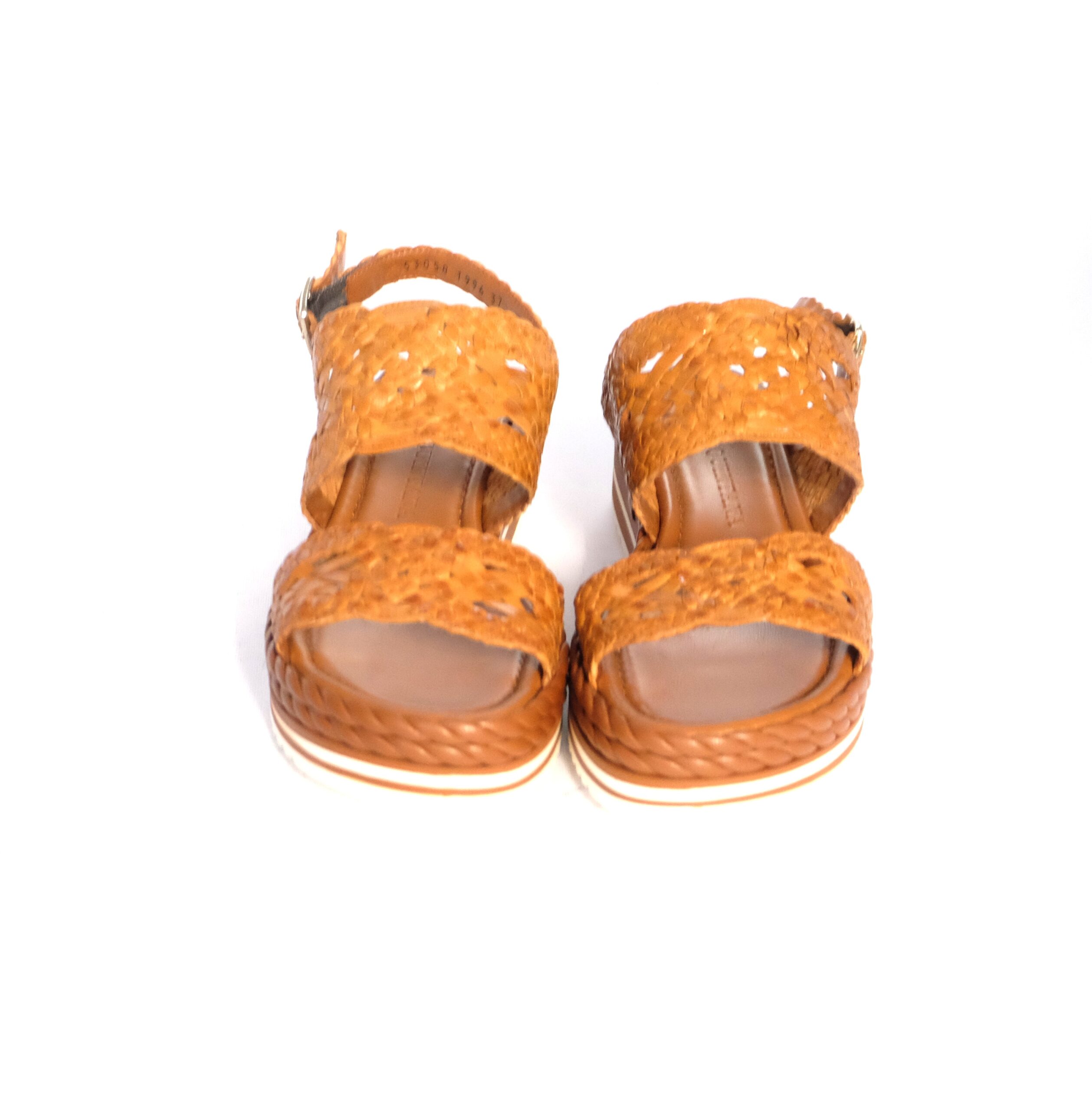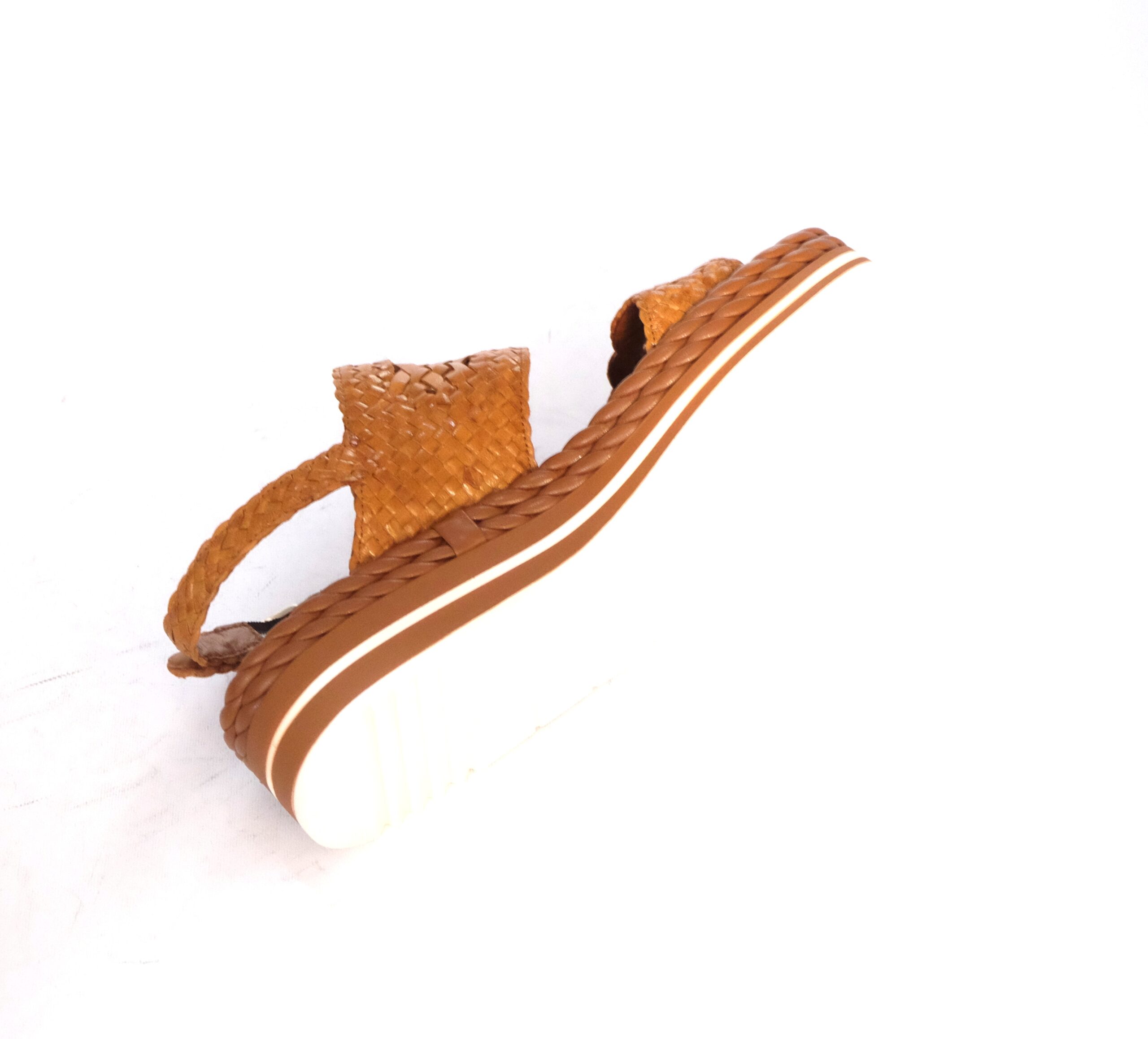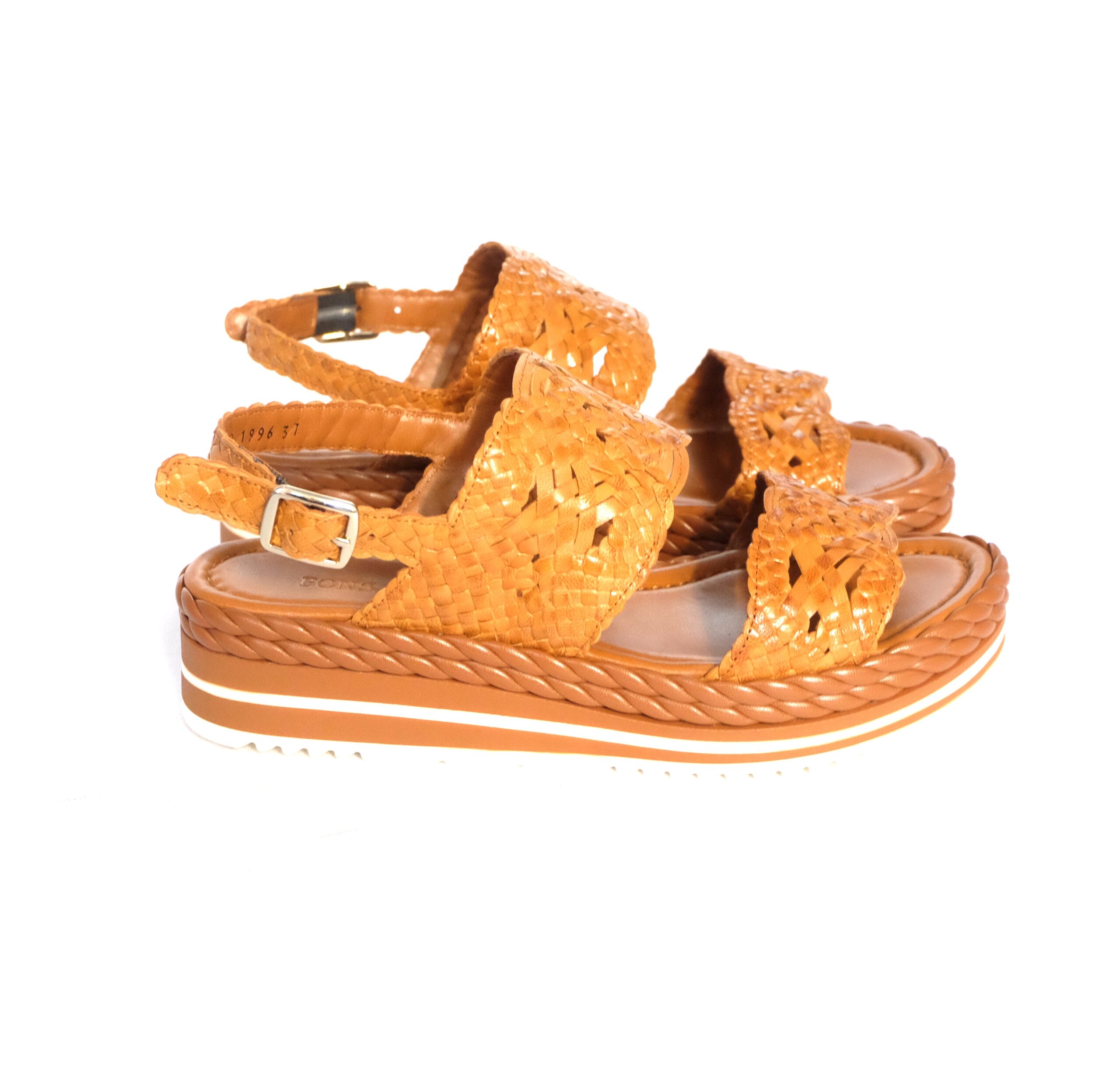 Sandalo con doppia fascia intrecciata in pelle toffe, cinturino al tallone, zeppa leggerissima rifinita con intreccio in pelle, suola in gomma leggerissima antiscivolo, calzata standard, sottopiede imbottito in pelle.