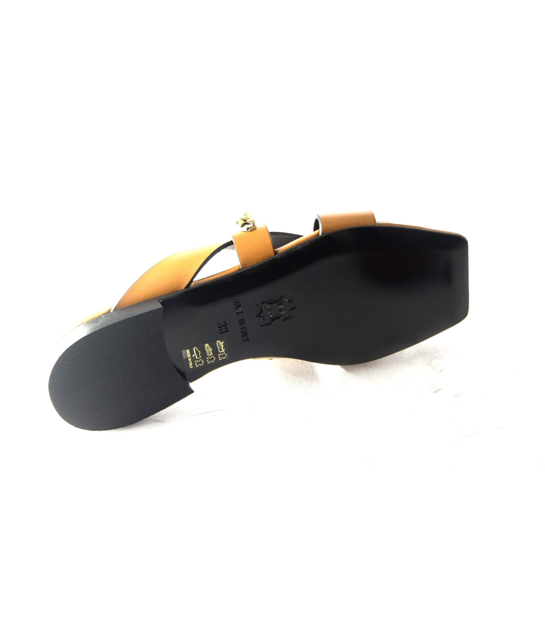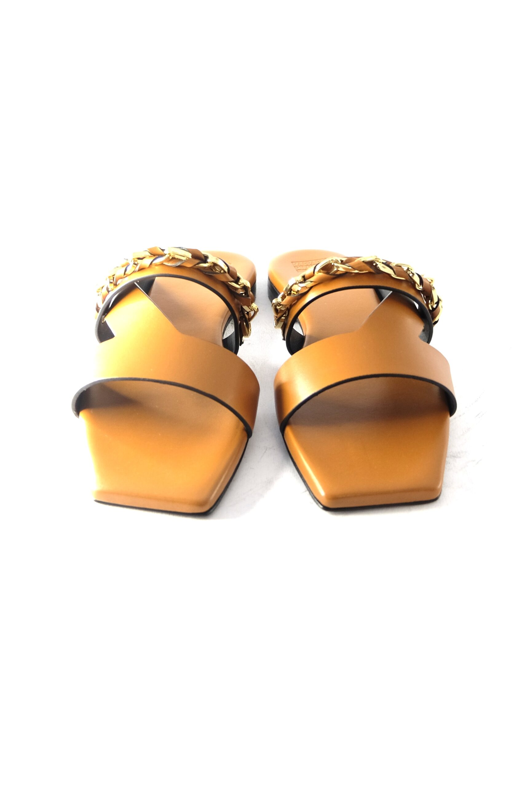 Sandalo pianella in pelle cuoio, accessorio catena color oro, sottopiede imbottito in pelle , suola in cuoio flessibile antiscivolo, calzata standard