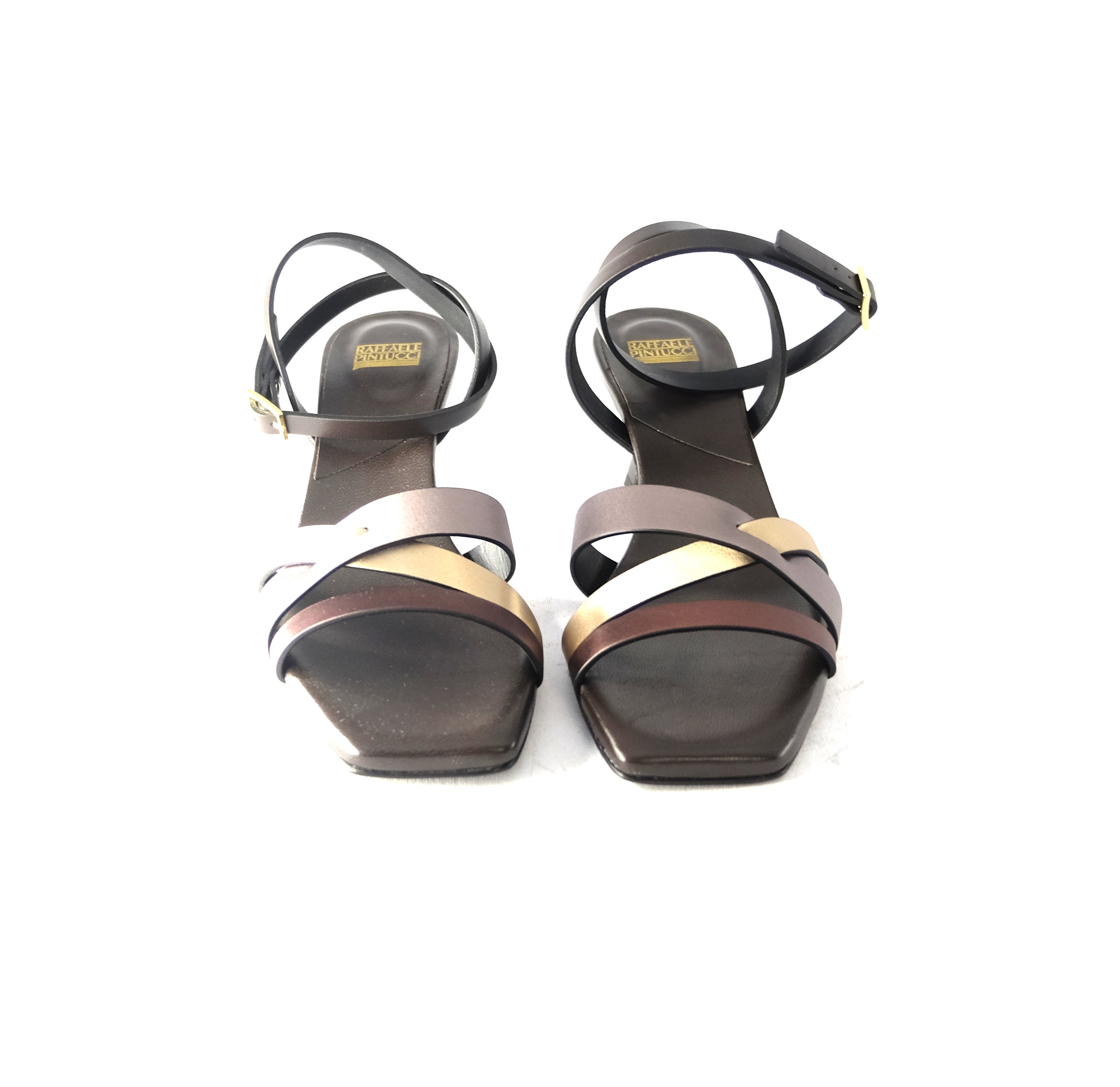 Sandalo con tacco 60, cinturino alla caviglia, pelle multicolor (oro, antracite, cacao) , sottopiede in pelle imbottita, suola in cuoio flessibile antiscivolo, calzata standard