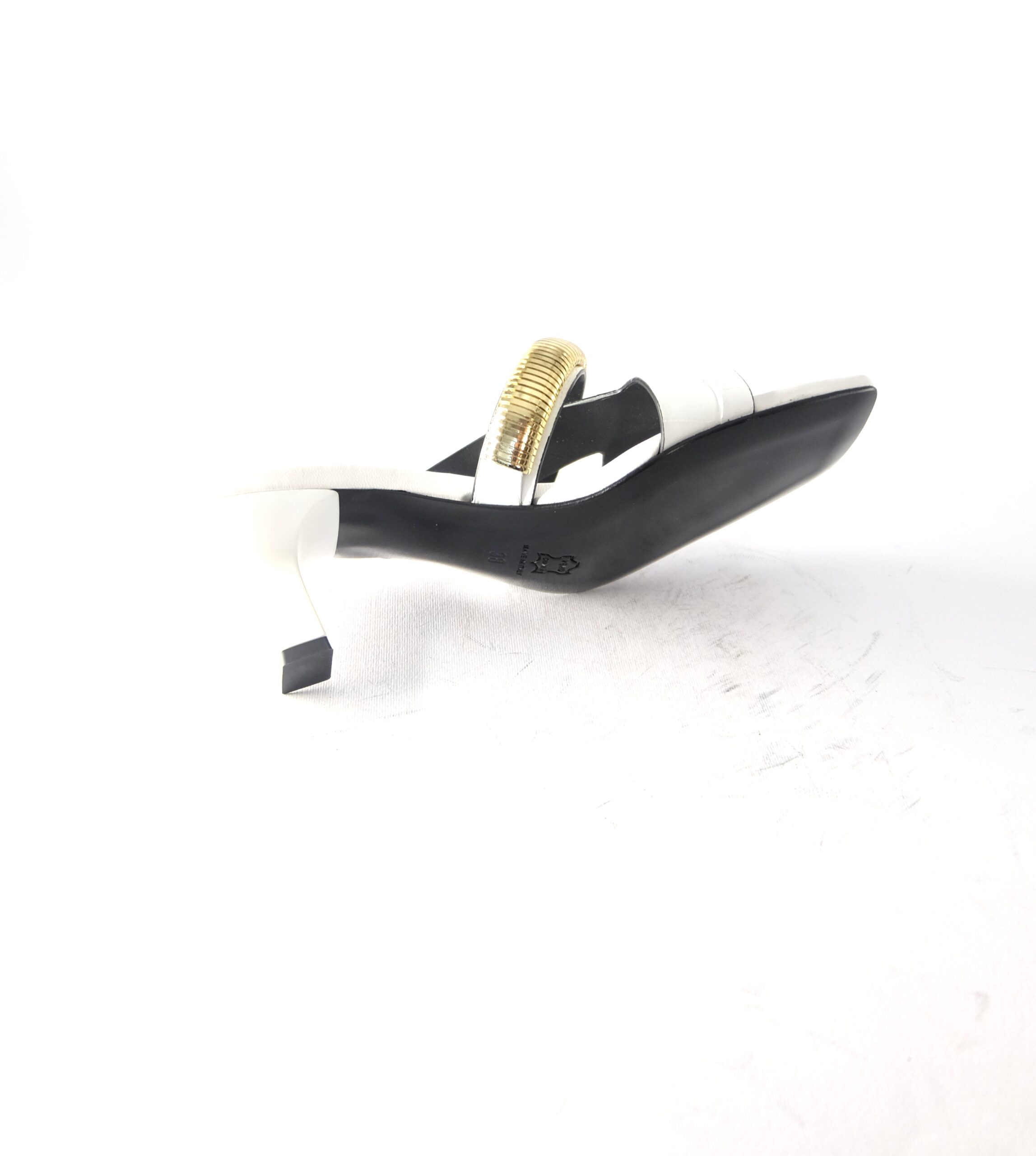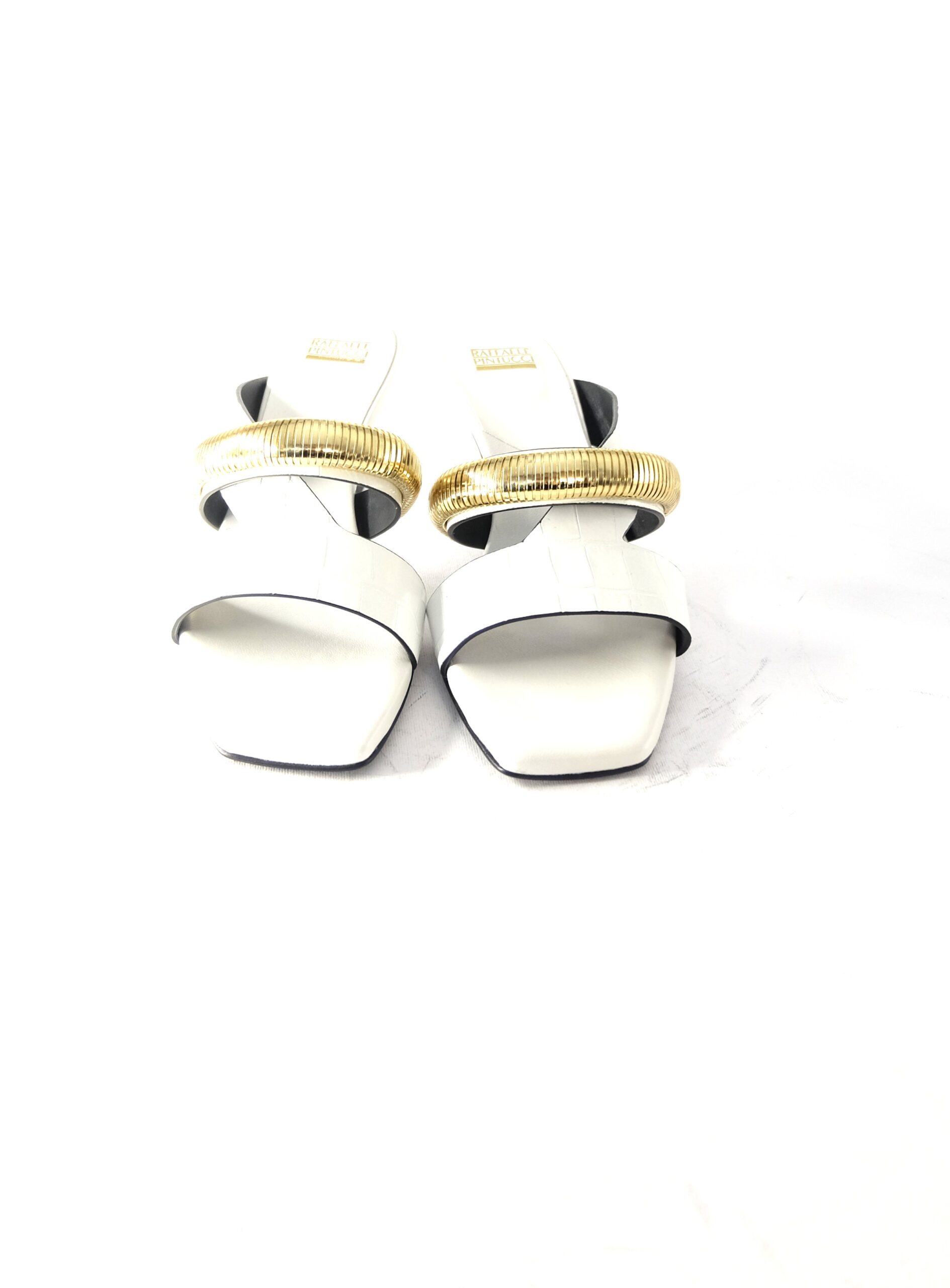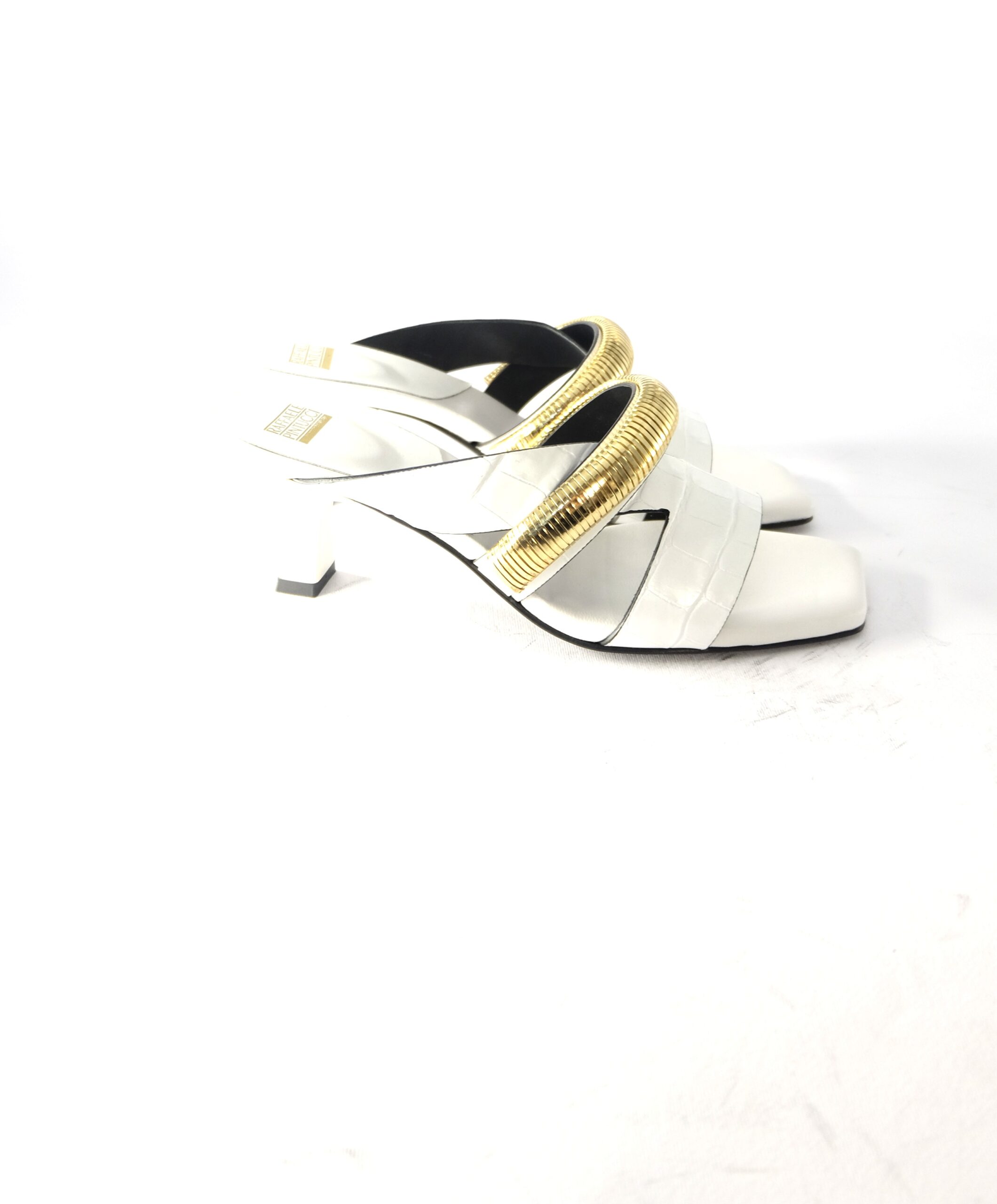 Sandalo tacco 60 in pelle stampa cocco bianco con fascia in metallo oro, sottopiede imbottito in pelle, suola in cuoio flessibile antiscivolo, calzata standard