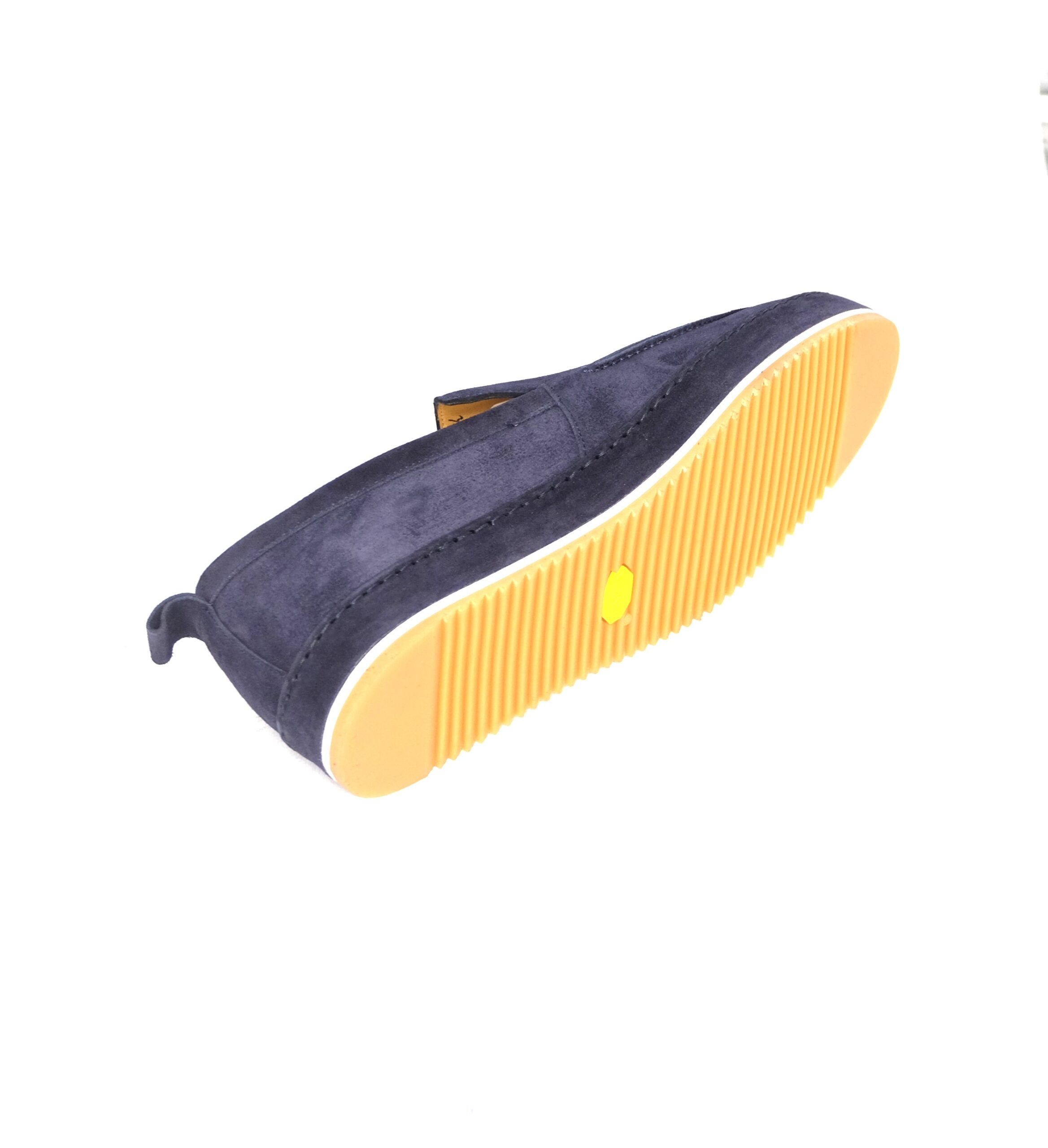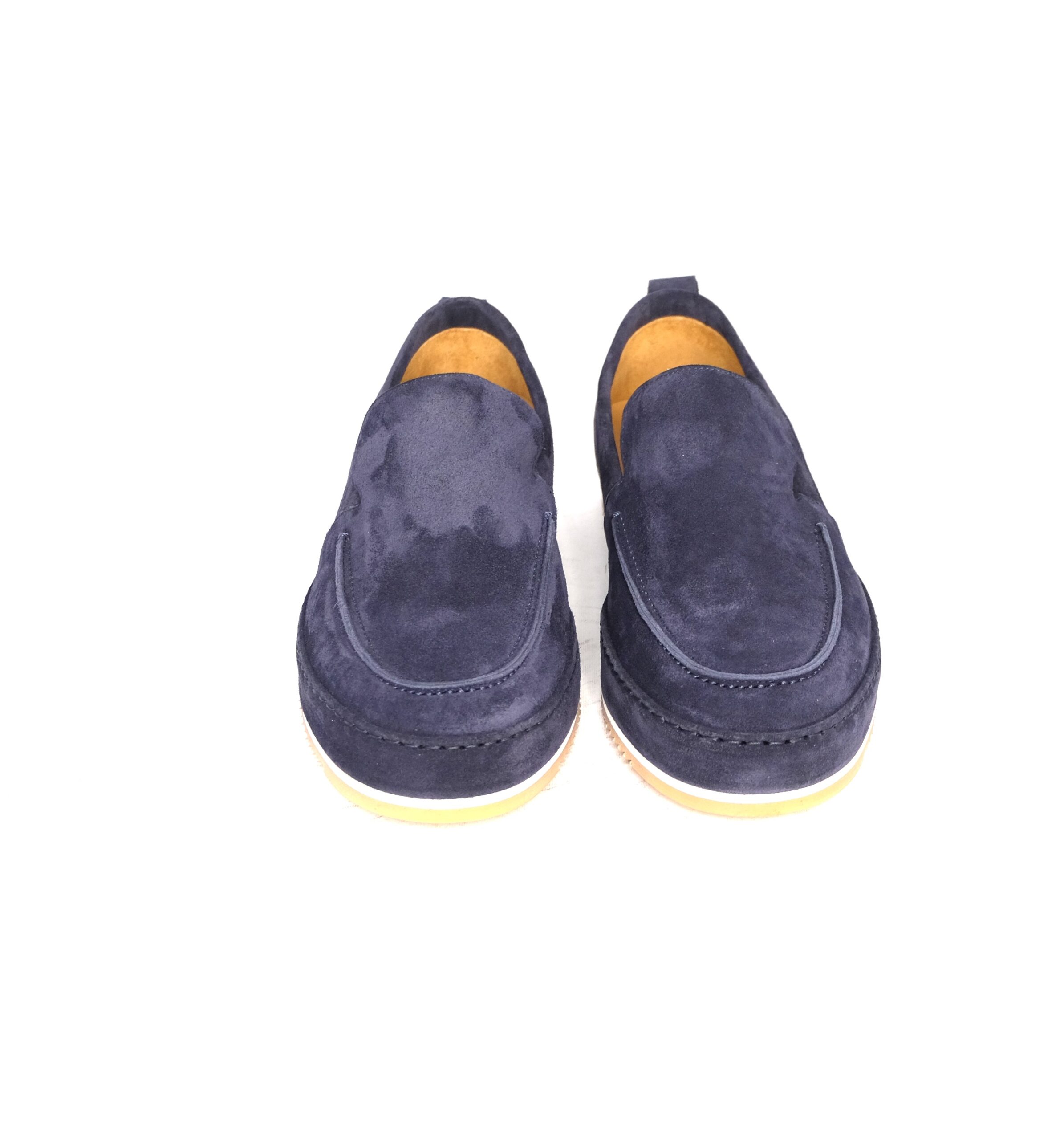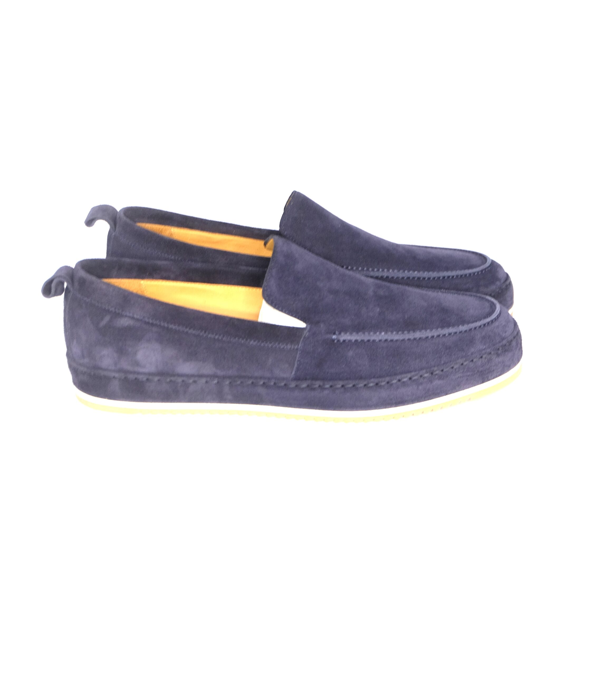 Slip-on in camoscio blu con suola ricoperta sempre in camoscio, sottopiede foderato in nappa, suola antiscivolo vibram