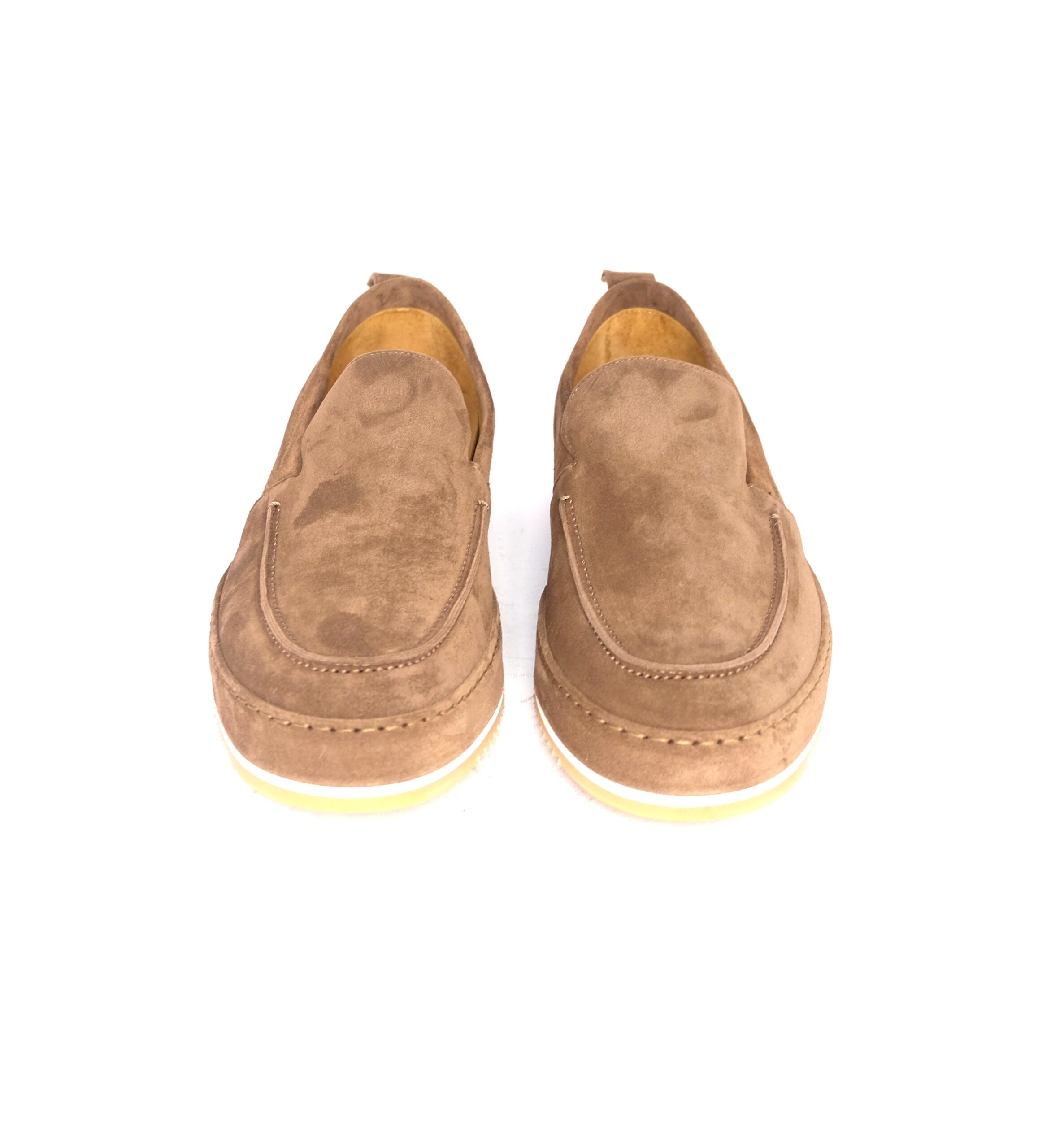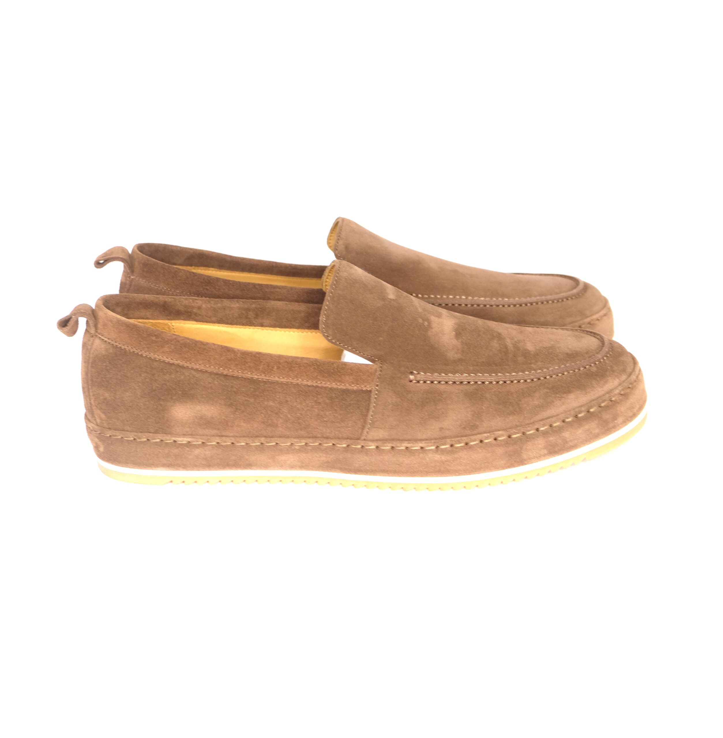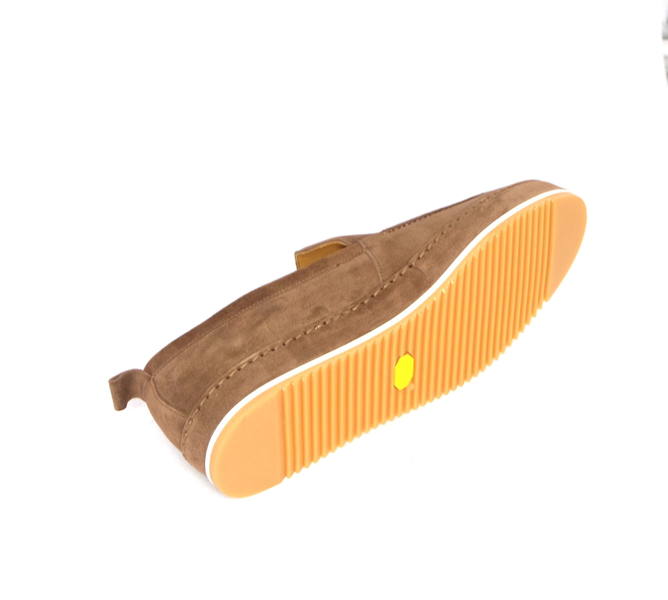 Slip-on in camoscio espresso con suola ricoperta sempre in camoscio, sottopiede foderato in nappa, suola antiscivolo vibram