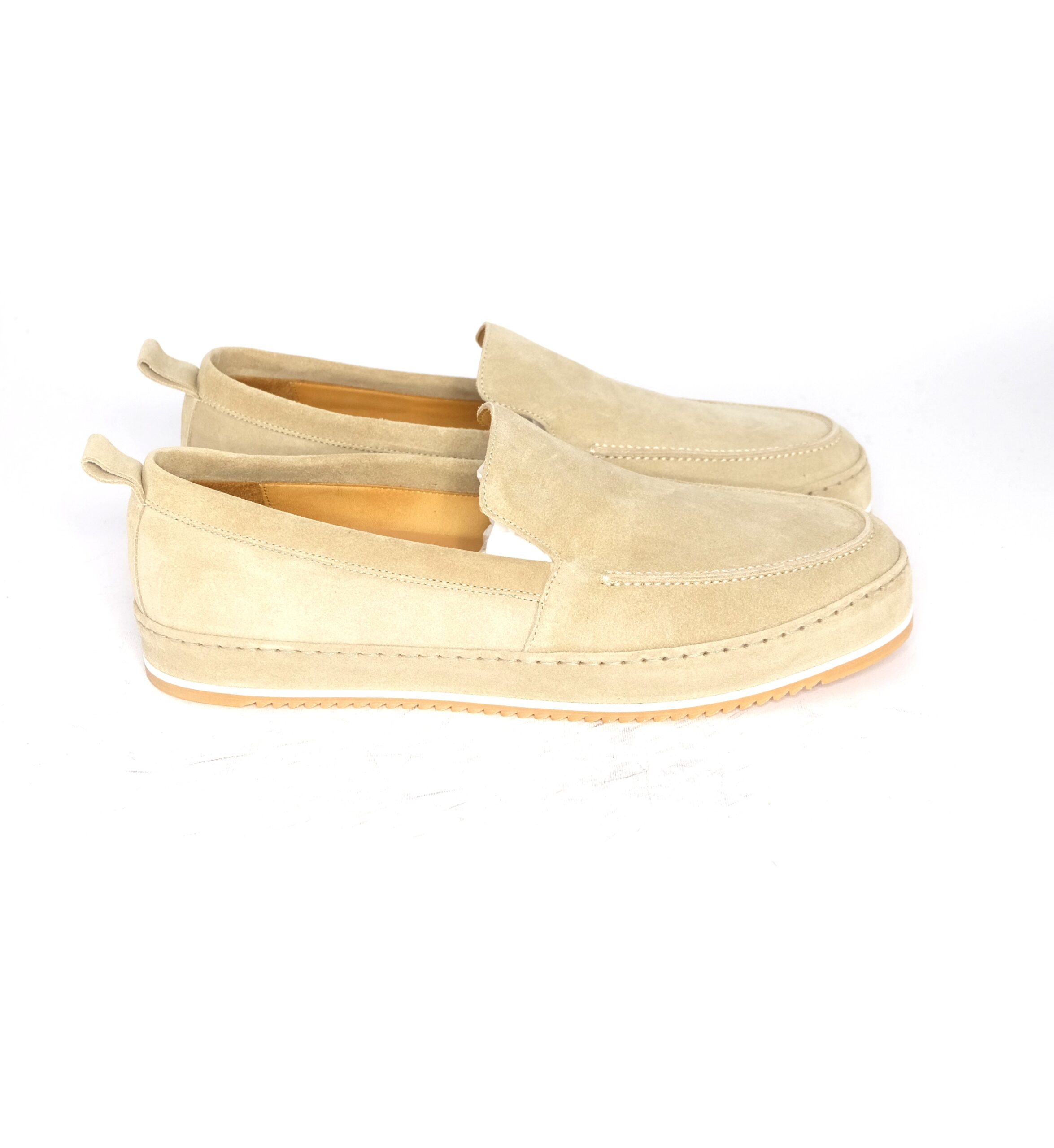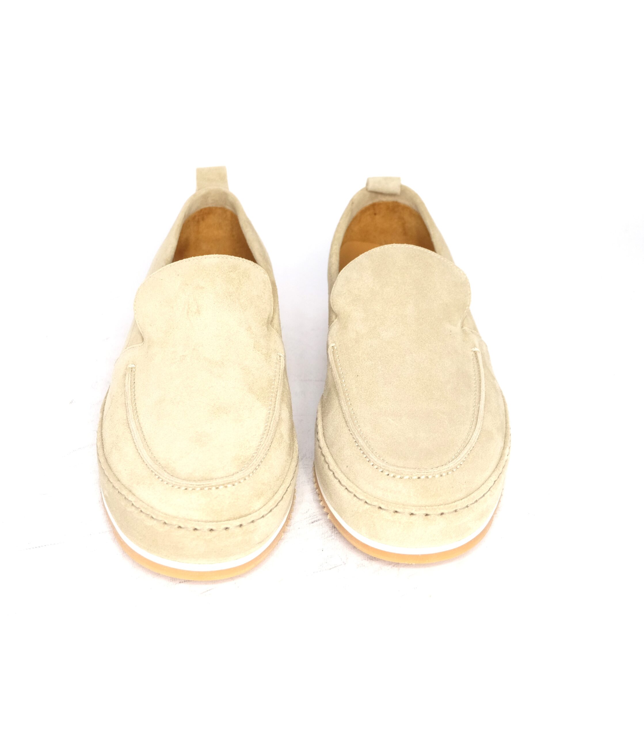 Slip-on in camoscio sabbia  con suola ricoperta sempre in camoscio, sottopiede foderato in nappa, suola antiscivolo vibram