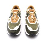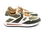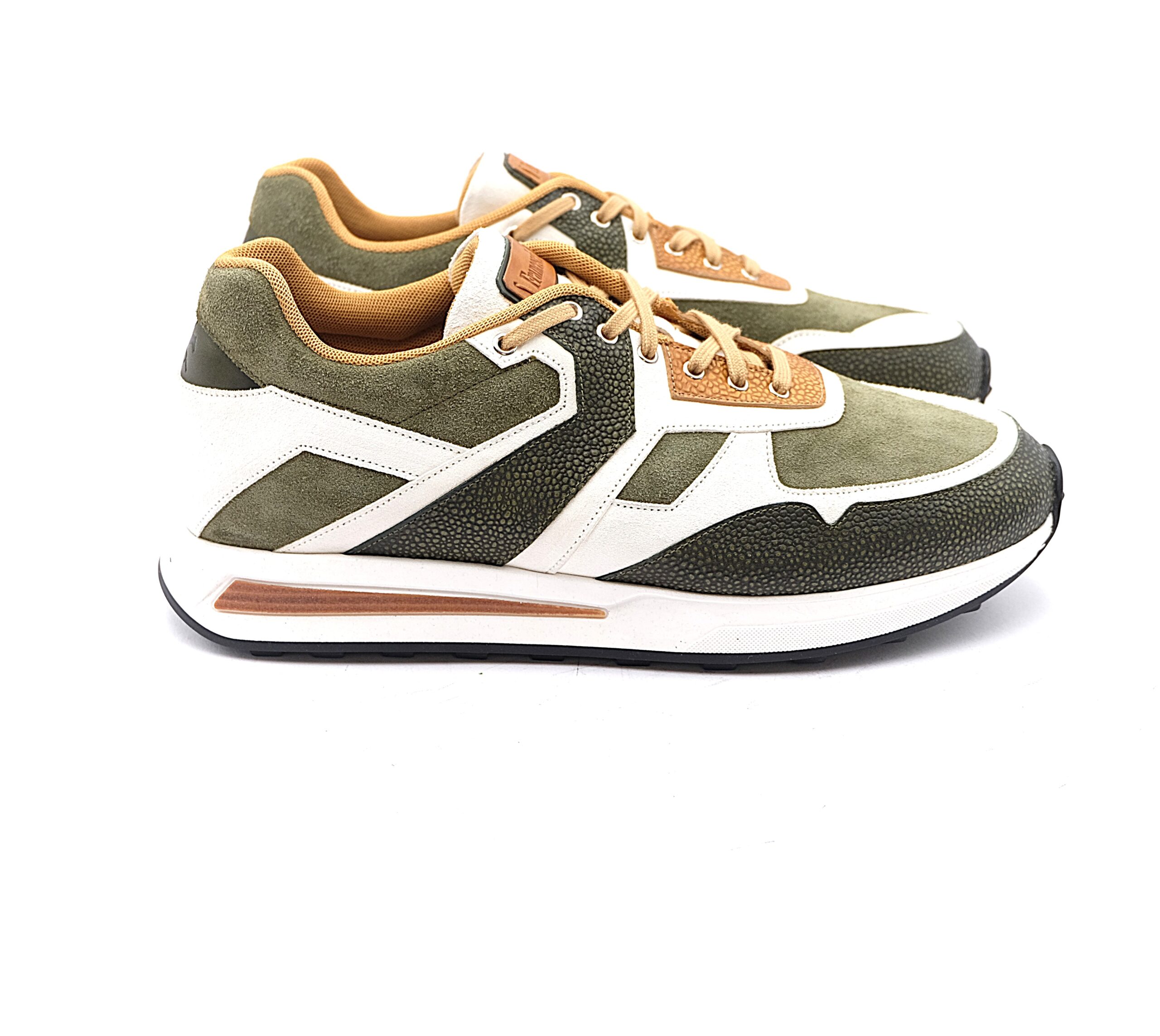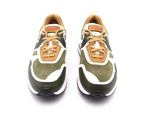 Sneakers lusso Franceschetti, tomaia realizzata con pelle chicco di riso verdone ed inserti in camoscio verde scuro, fodere in pelle rivestita in tessuto nocciola, sottopiede in cuoio con fussbet estraibile, calzata standard, lacci di ricambio in tinta.