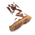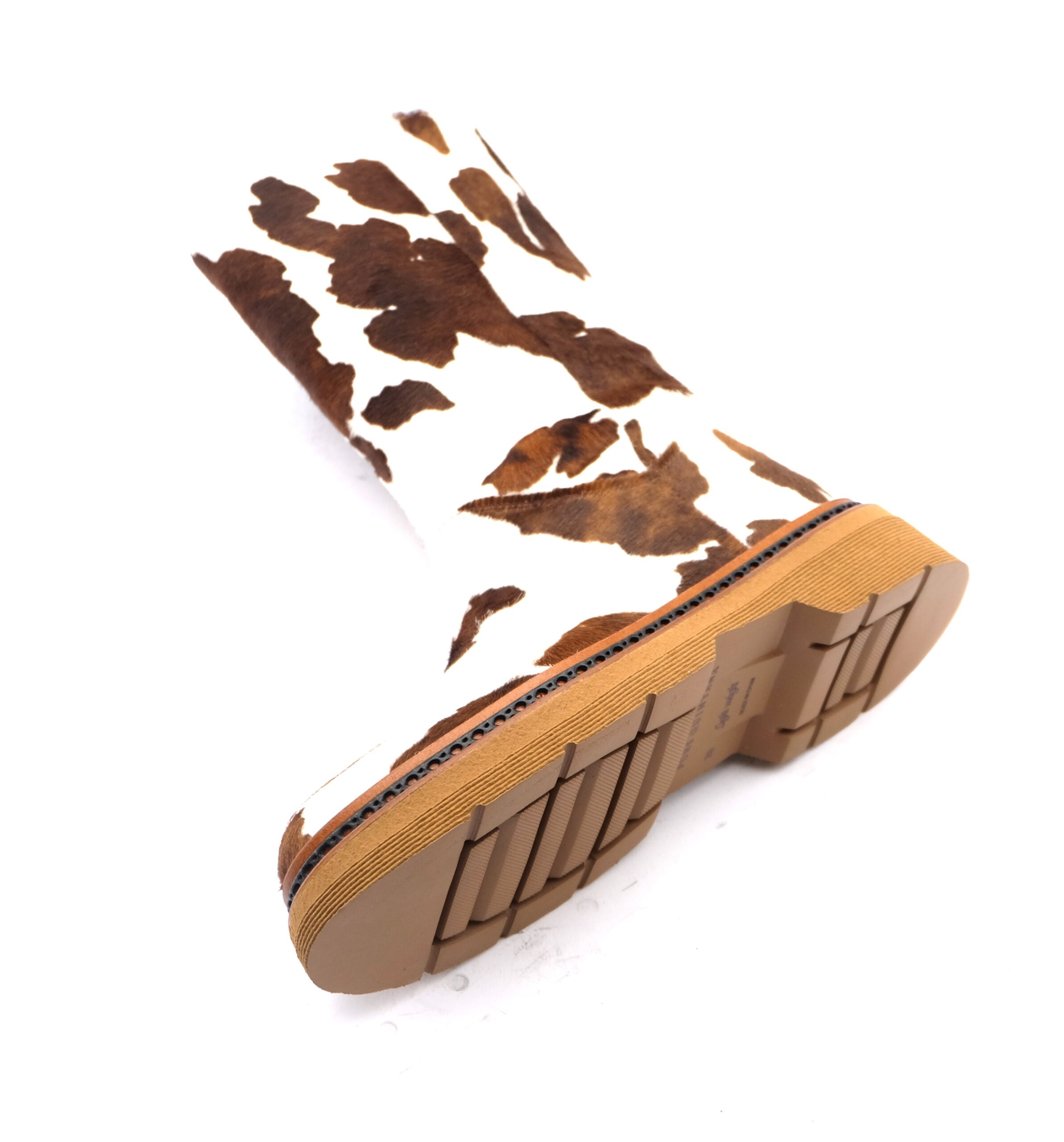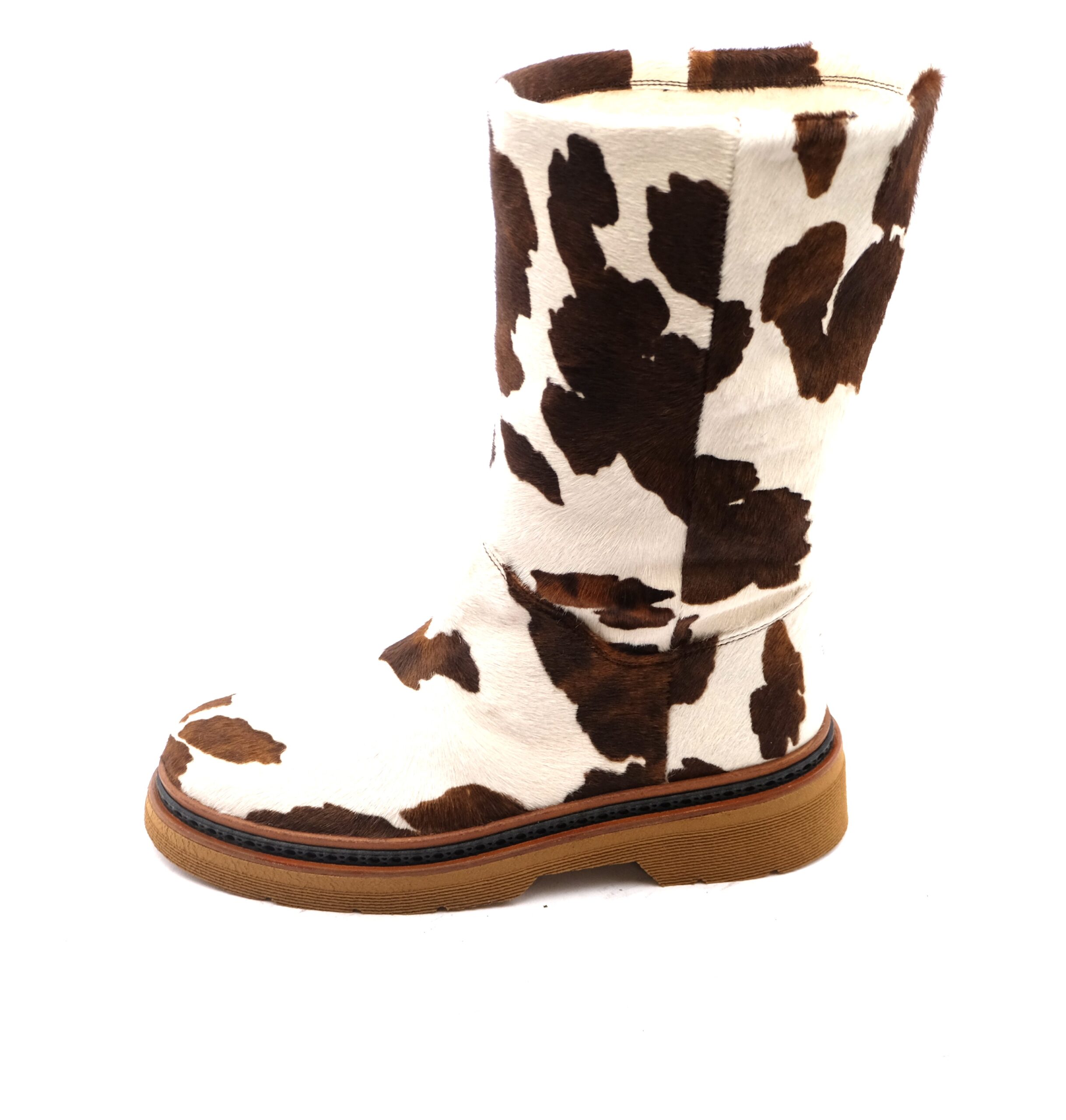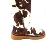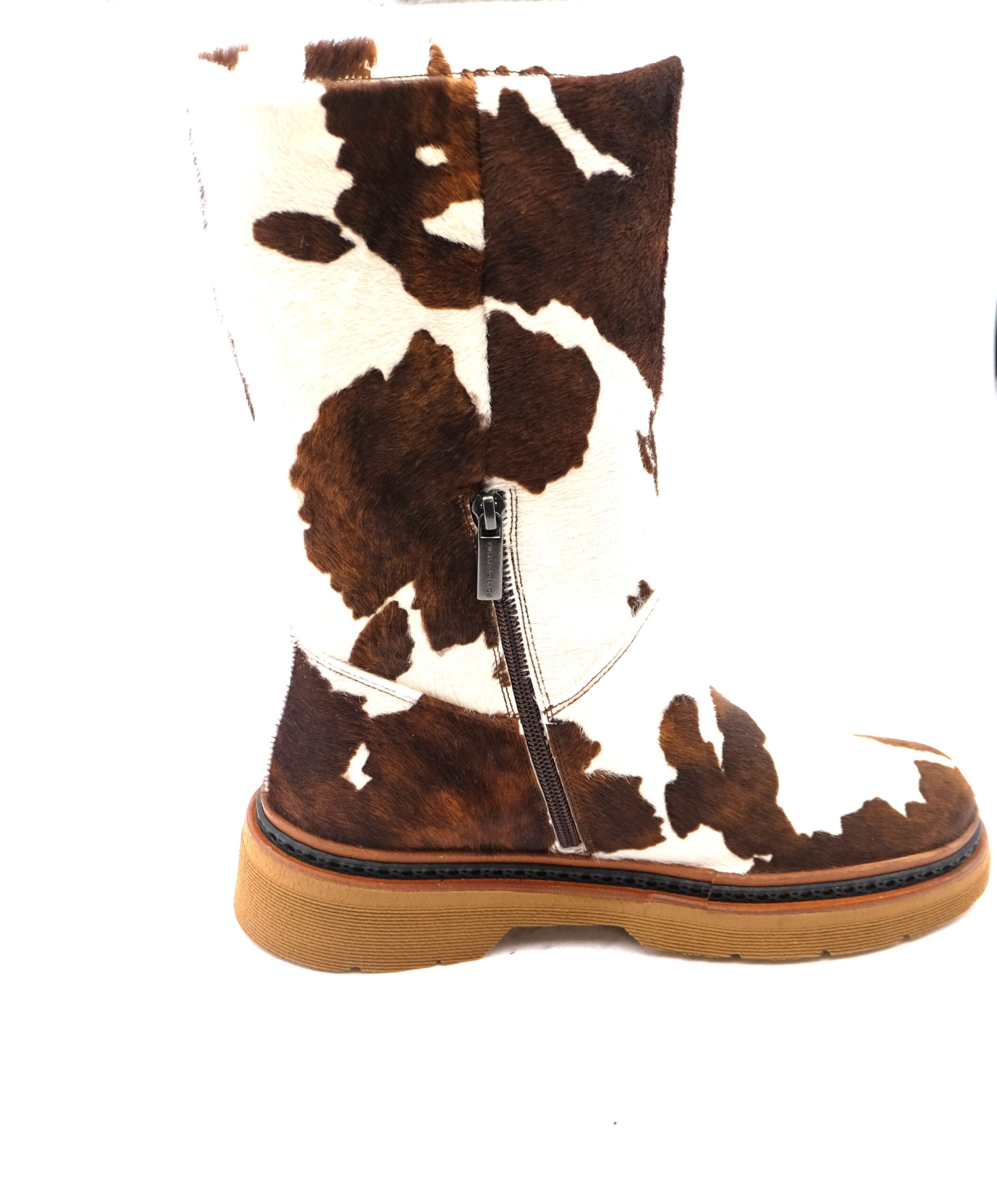 Stivale in stampa maculata bianca e marrone, cerniera laterale , fodera in pelo, suola in cuoio più gomma miele leggera antiscivolo, calzata standard
