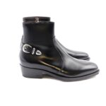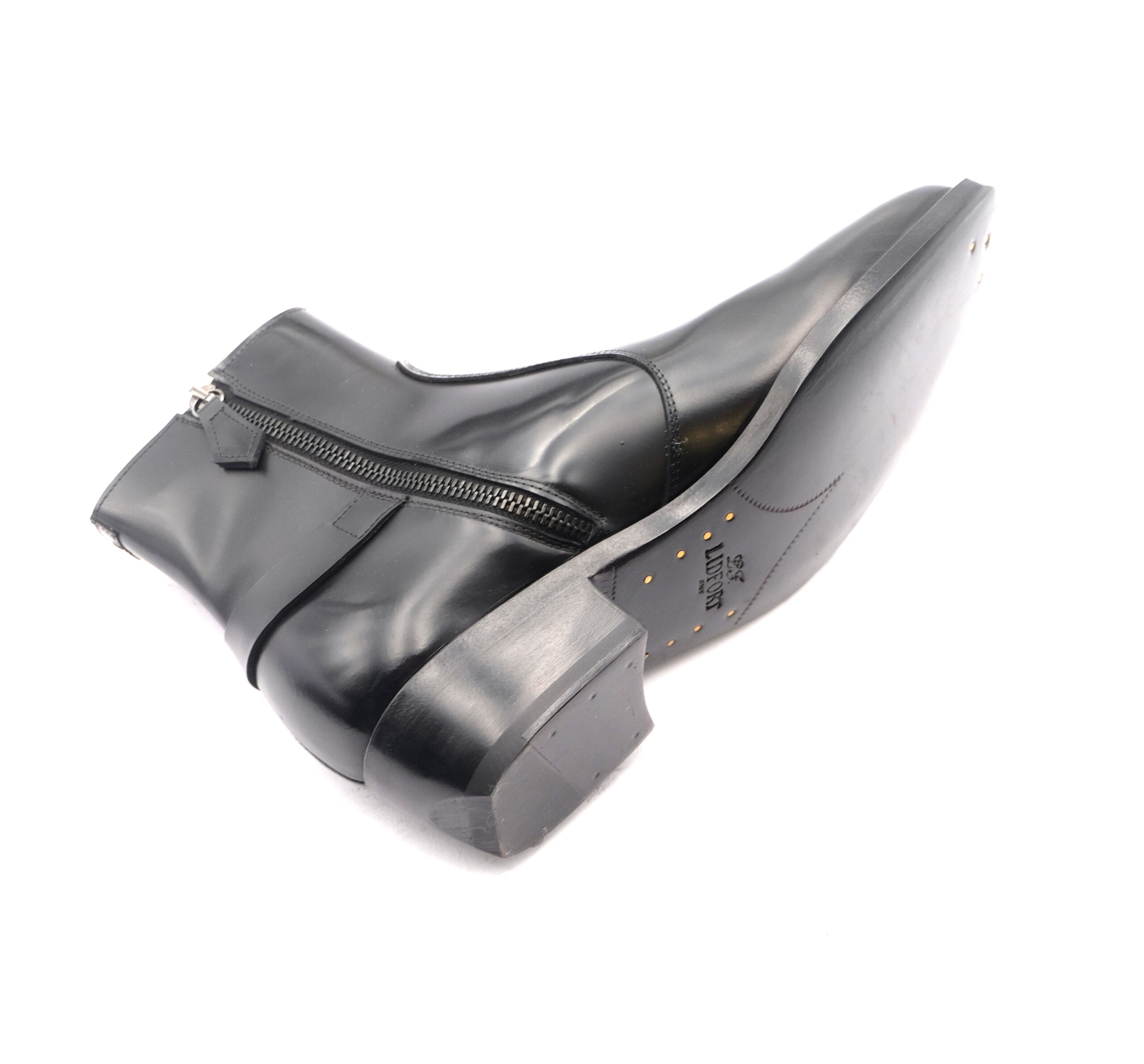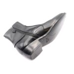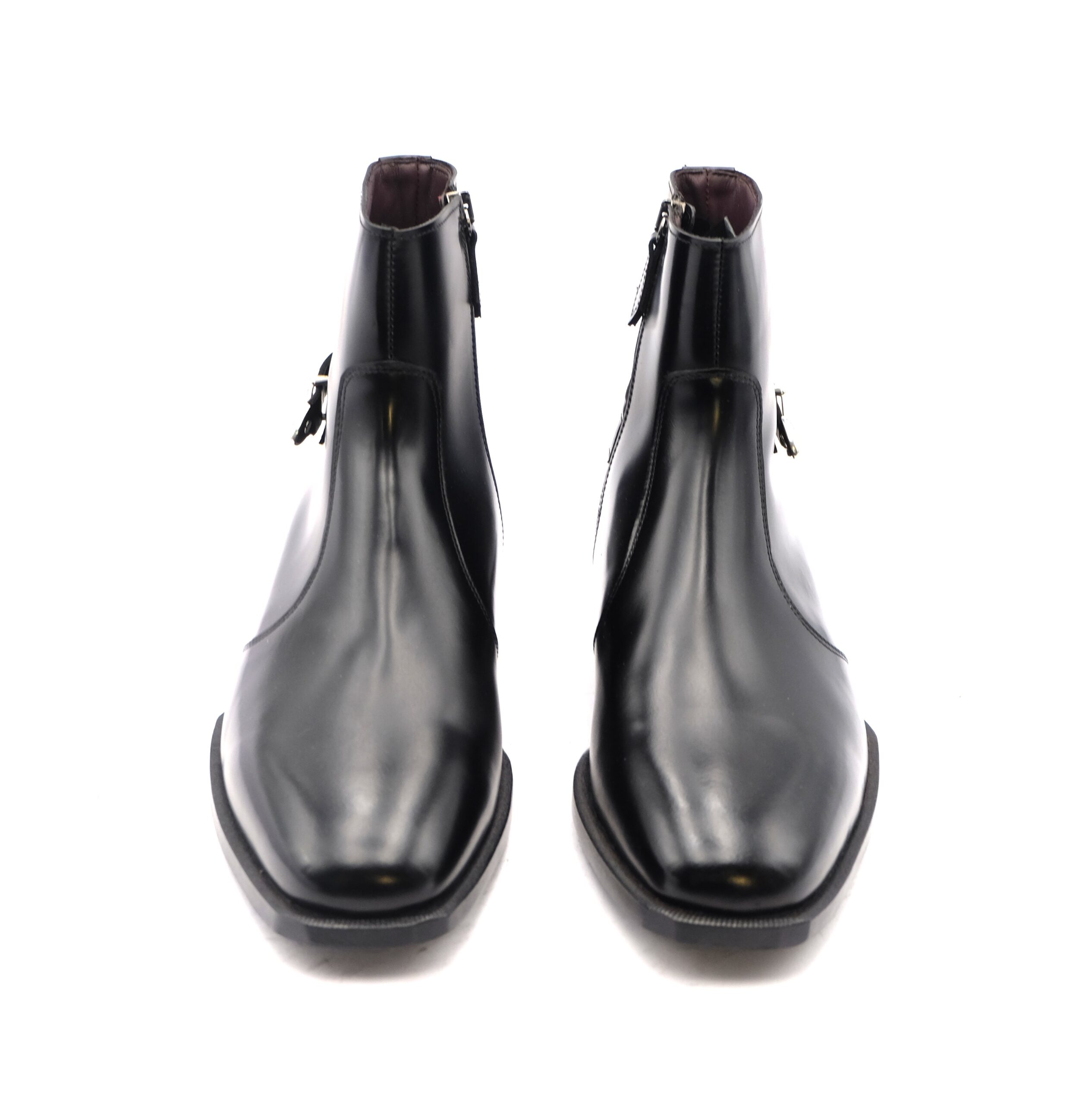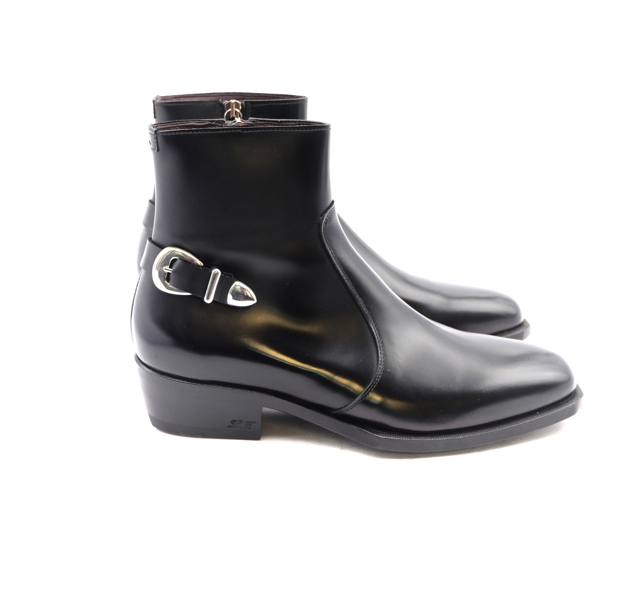 Texano con fibbia posteriore decorativa, realizzato in pelle antik nera, cerniera laterale, tacco cubano, suola in cuoio doppio, calzata standard.